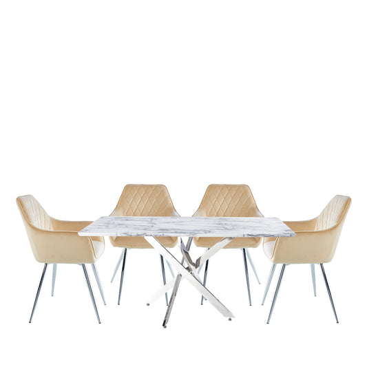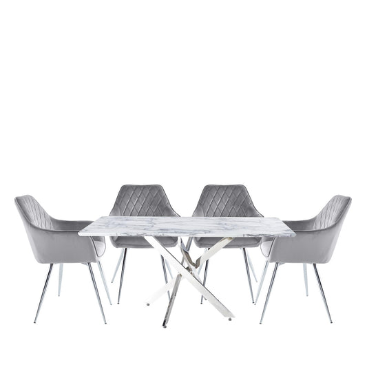 Out of Stock - Message to Pre-OrderLusso Dining Table White Marble And Chrome & 4 Grey Chairs