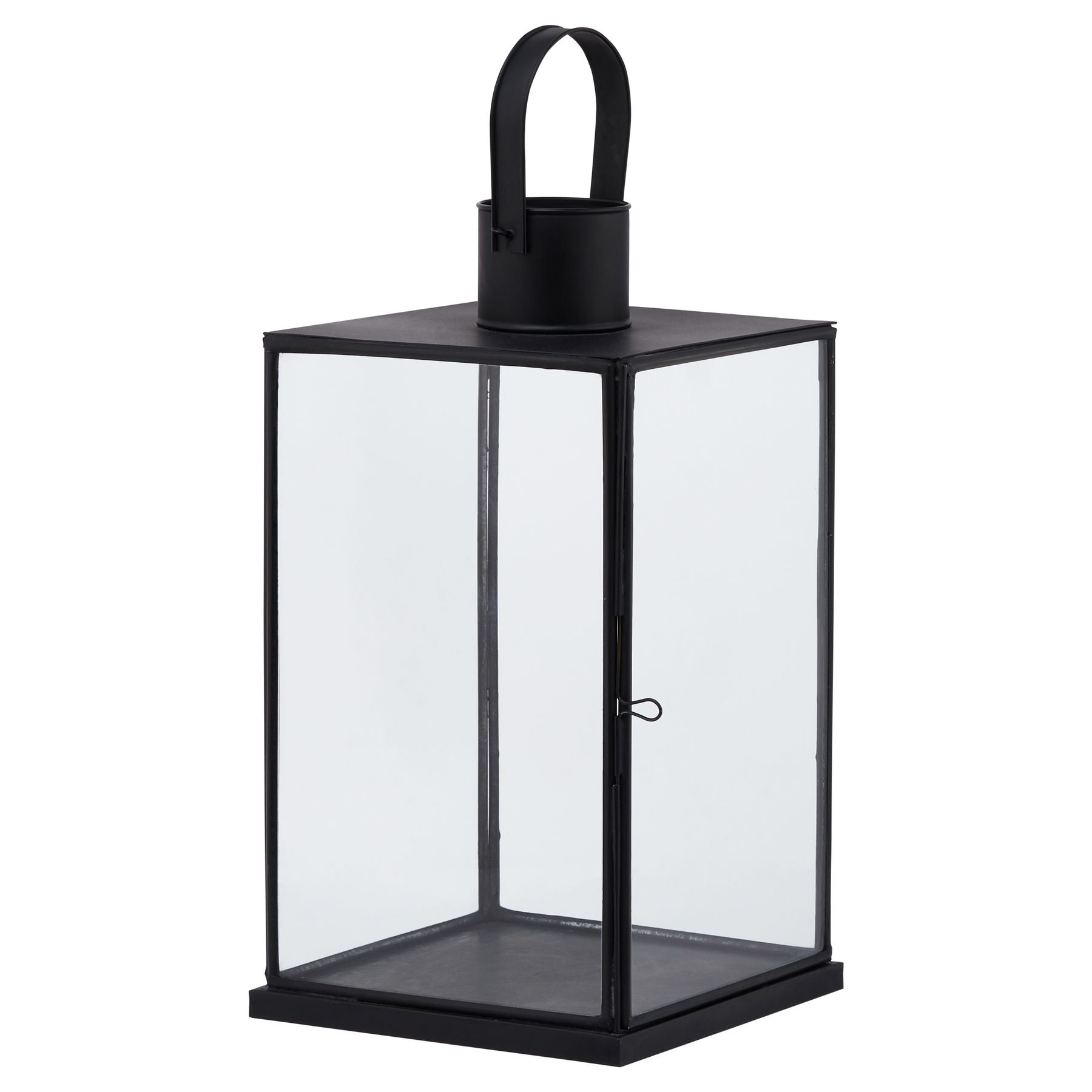 This is the Flat Top Small Black Lantern. This stylish black metal lantern is a contemporary style statement that will add not ambience and interest to a space. Additional sizes available in the same style for impactful staggered height displays. Finish the look with one of our realistic LED wax candles.