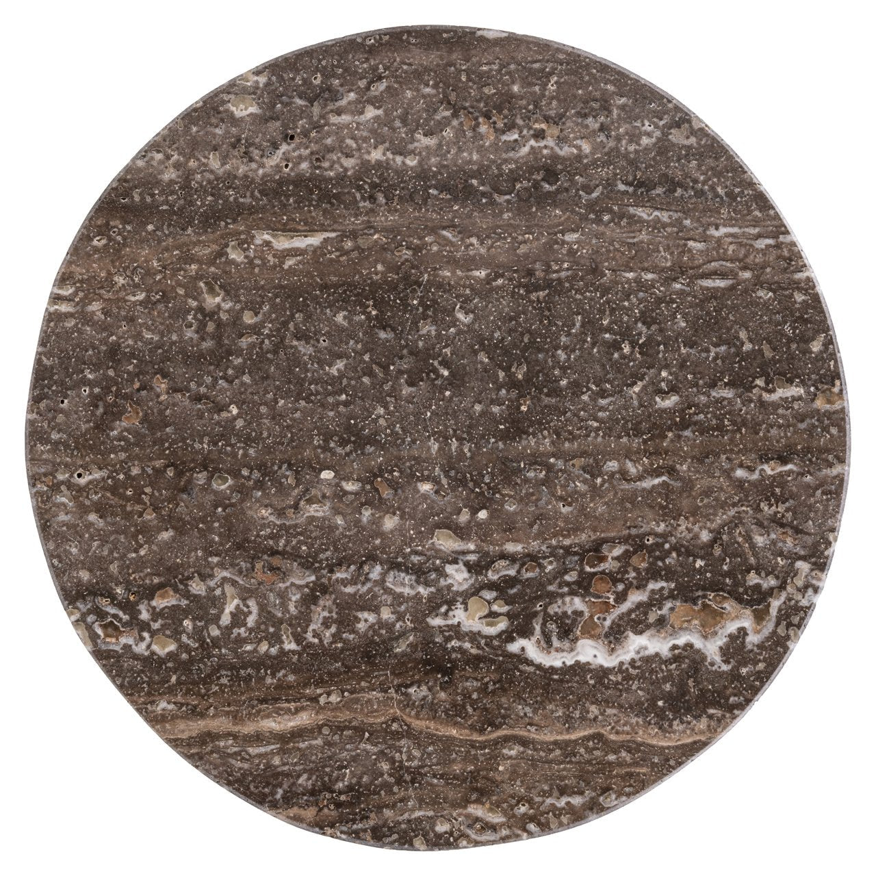 This end table features a round shape with a compact, closed silhouette. The bronze finish with a subtle sheen creates a warm and calm appearance. Its rounded lines make it suitable for placement next to seating furniture or an armchair.