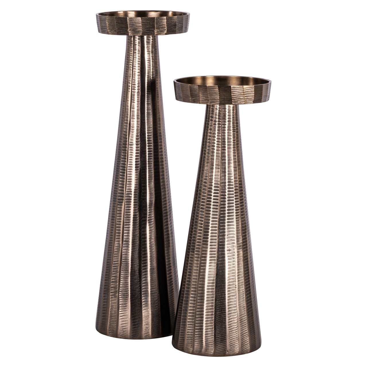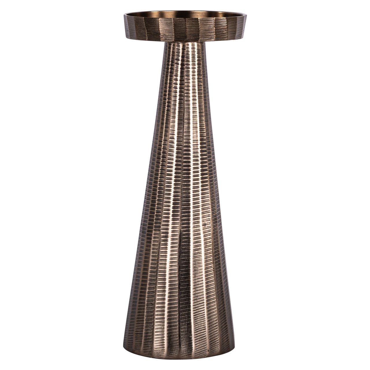 This small candle holder has a compact shape with a clear vertical structure. The bronze finish with a soft sheen creates a warm appearance. Its simple and balanced lines make it suitable for placement on a table sideboard or open shelf. The understated design allows easy combination with other decorative objects.