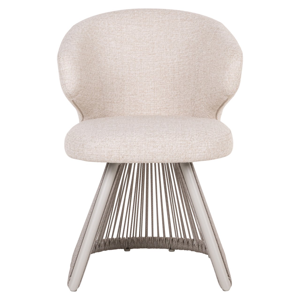 The Nuba dining chair in beige alpine features handwoven Olefin rope with high UV stability, a rust-free aluminium frame and a quick-dry seat cushion with waterproof inner layer. A refined mix of craftsmanship and outdoor performance. Also available in greige alpine.