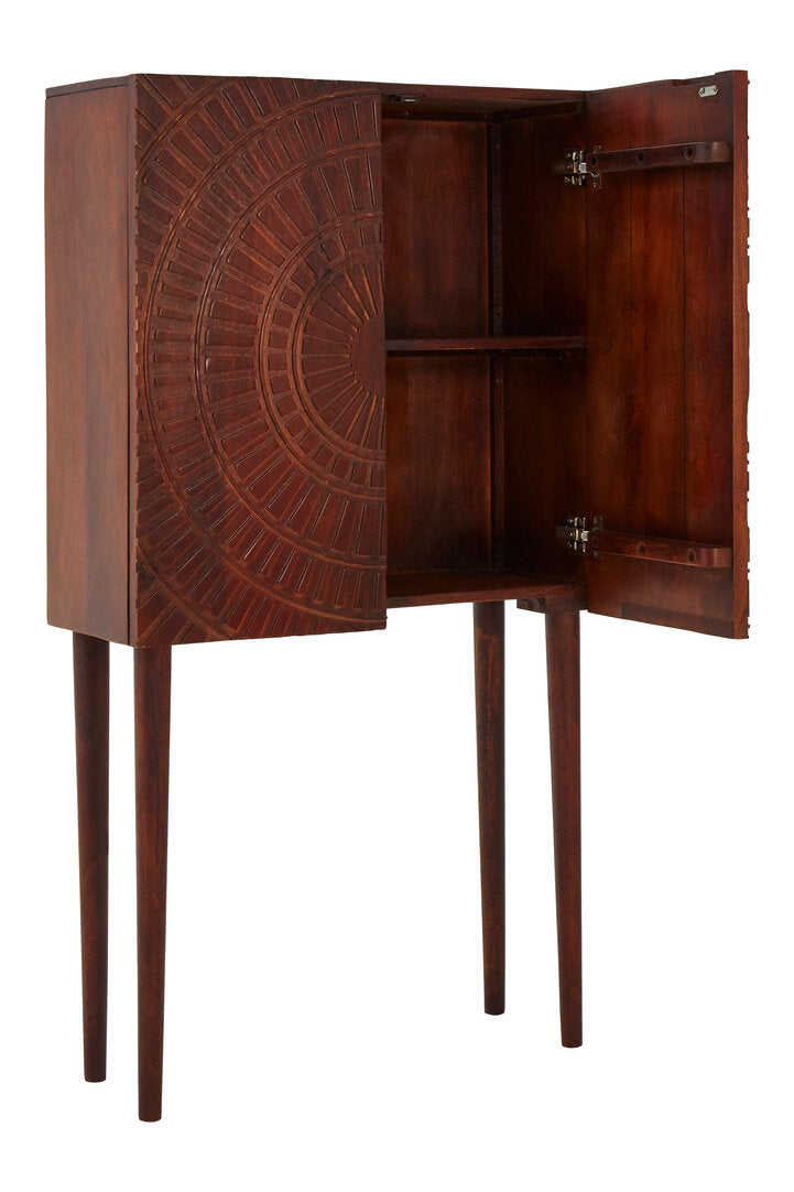 The Vence mango wood cabinet has a rich, dark finish that showcases the natural beauty of the wood grain. Its two doors are adorned with a large, hand-carved circle pattern that radiates out from the center, creating a stunning focal point. Standing on four tapered legs, the cabinet offers organised storage within, seamlessly blending unique craftsmanship with a modern form.