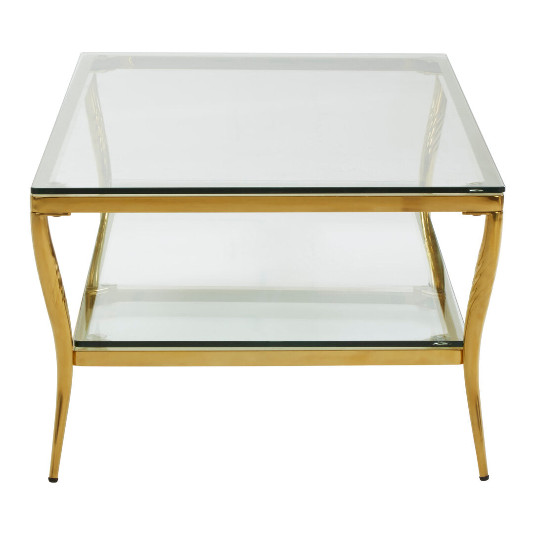 Its top is made from clear tempered glass and is help in place with a slender frame crafted from stainless steel. The steel is coloured gold for a luxurious finish. Part of the Arezzo collection.