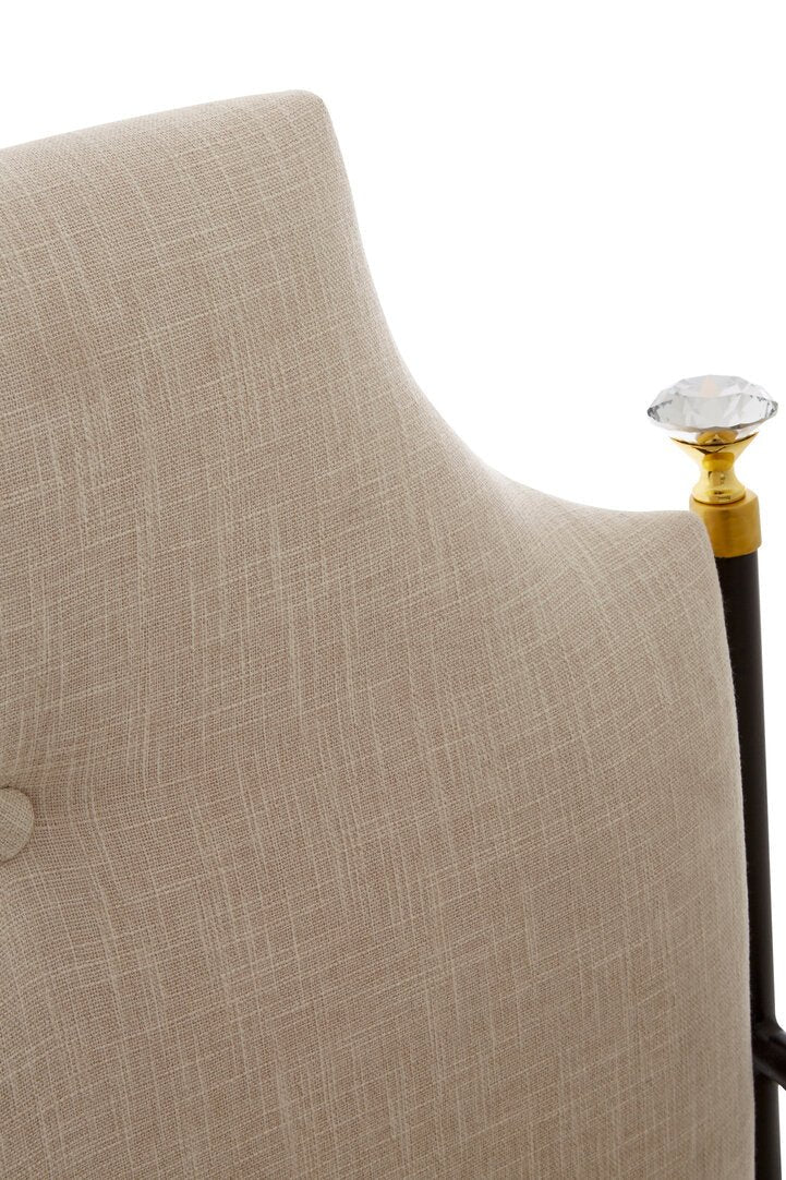 The black metal frame boasts tapered legs that add to the chair's elegant aesthetic. The cushions on the seat and backrest are made from soft linen and feature button tufting and a natural finish.