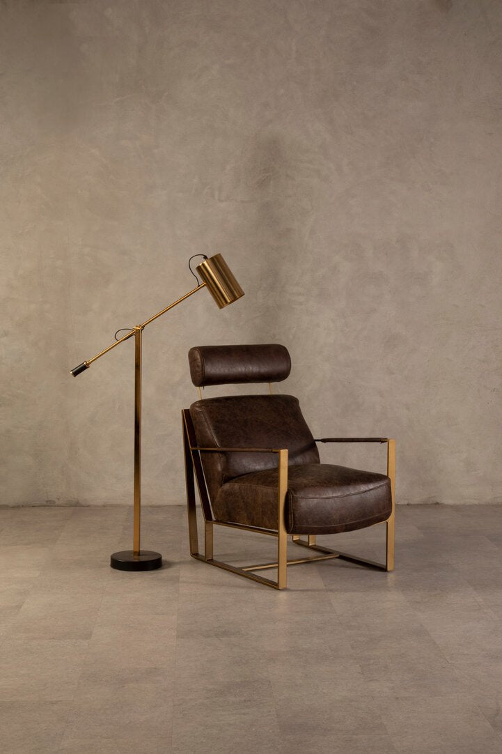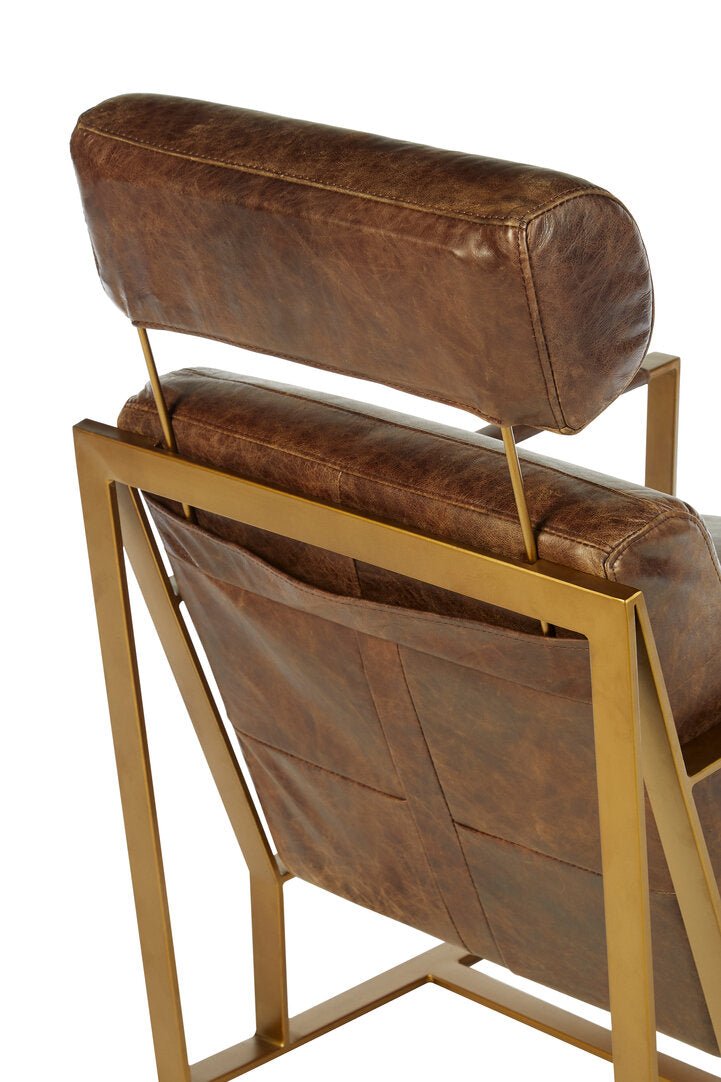 The Hoxton lounge chair's flat, angular legs are crafted from sturdy iron, with a rich gold finish lending a luxe edge. The chair's seat and backrest are made from plump, stuffed cushions upholstered in genuine brown leather. Prominent distressing of the chair offers a rustic touch to it.