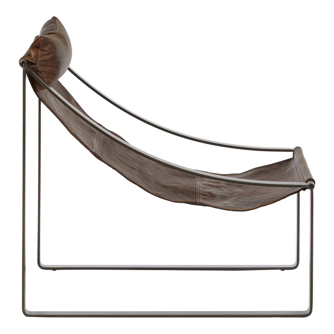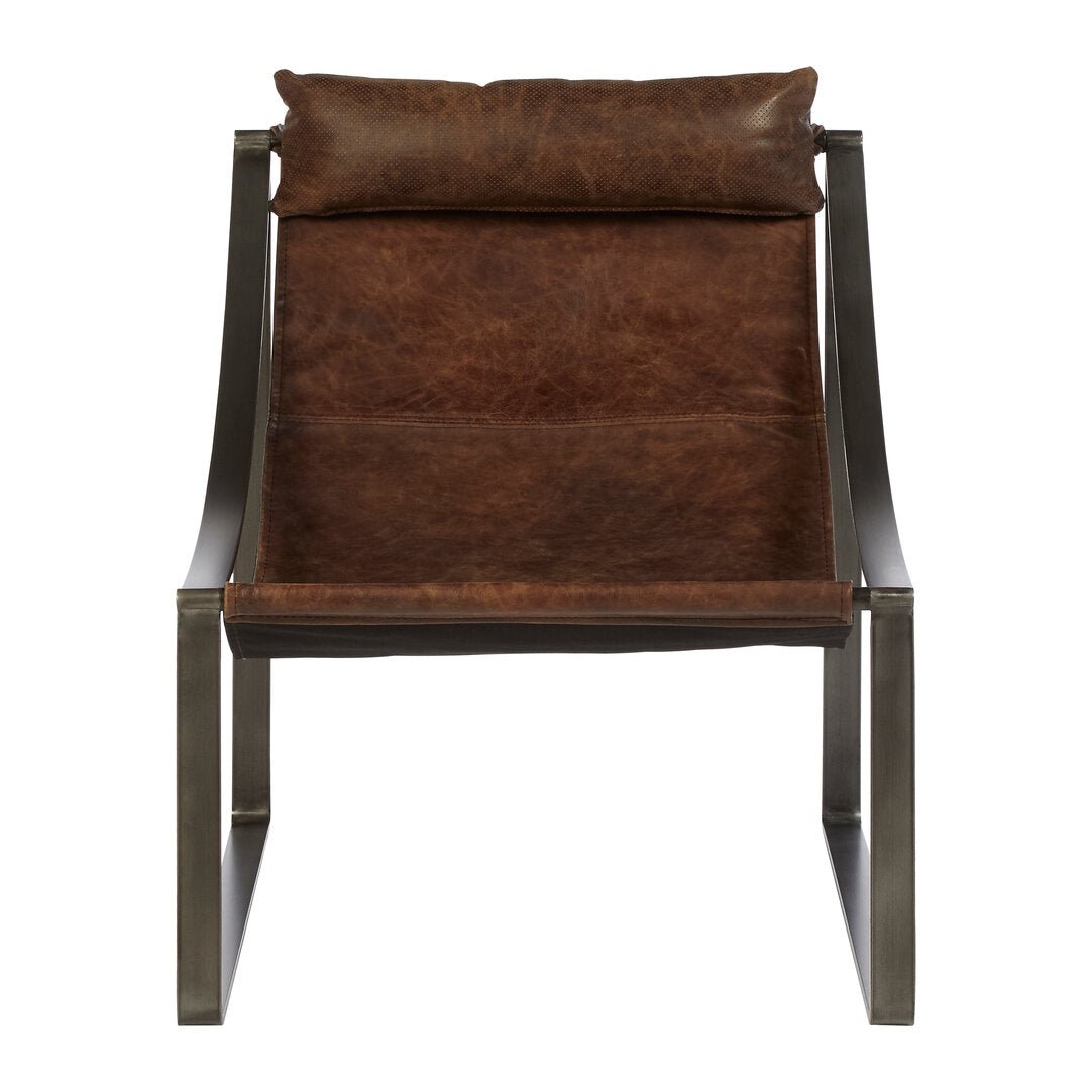 The Hoxton chair features distressed brown leather with fine stitching detail. Its slender iron frame introduces a clean structure, while the sledge base provides stability. Finished with a padded, leather-upholstered headrest, this sling chair offers both visual appeal and support in the living room.