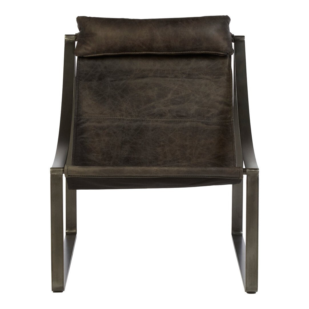 The Hoxton sling chair features antique black leather with fine stitching detail. Its slender iron frame introduces a clean structure, while the sledge base provides stability. Finished with a padded, leather-upholstered headrest, this sling chair offers both visual appeal and support in the living room.