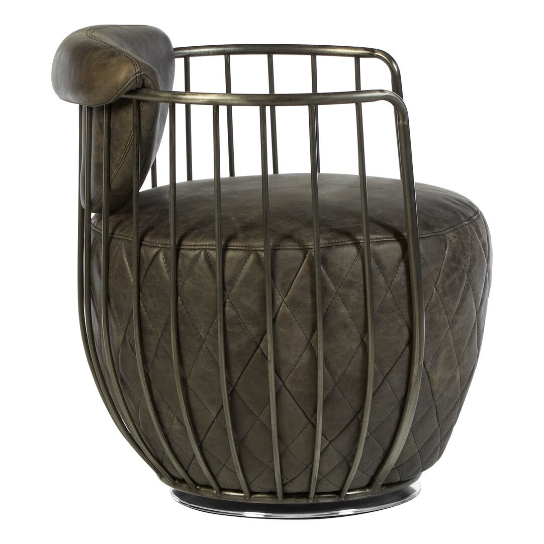 Exhibiting a natural juxtaposition to the iron fixture, the seat and backrest of this chair are upholstered in distressed ebony leather. The quilted detail lends a textured feel to the chair, while the swivel base underneath allows a 360° rotation.