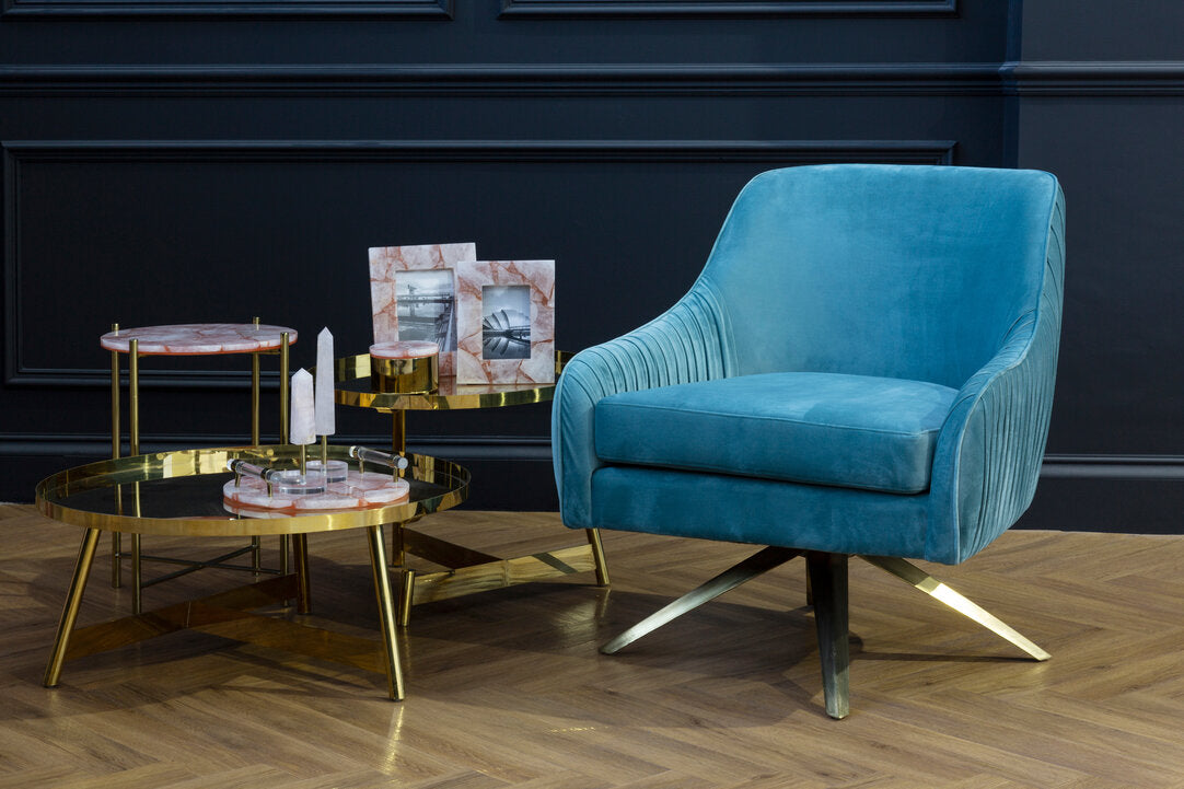 The Vita side table adopts a classic silhouette, providing a fresh perspective thanks to distinctive material choices. The table's round top is made from natural pink quartz, adding a touch of elegance, while the slender metallic frame boasts a luxurious style.