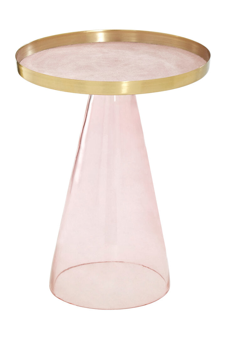 This side table features an inverted cone shaped base supporting a round acrylic top with gold finish raised iron edges. The pink and gold combination gives the side table a luxe appearance and makes it an accent piece.
