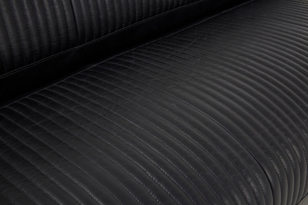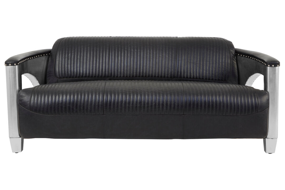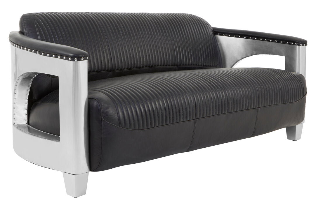 The Victor three-seater sofa merges luxurious comfort with an industrial or aviation-style aesthetic. The main body is upholstered in rich black leather, featuring striking vertical channel tufting that adds texture and visual interest. The arms and feet are the most distinctive elements, constructed from polished silver-tone aluminium that forms a structural frame. The decorative metal studs enhance its bold look.