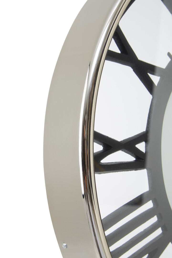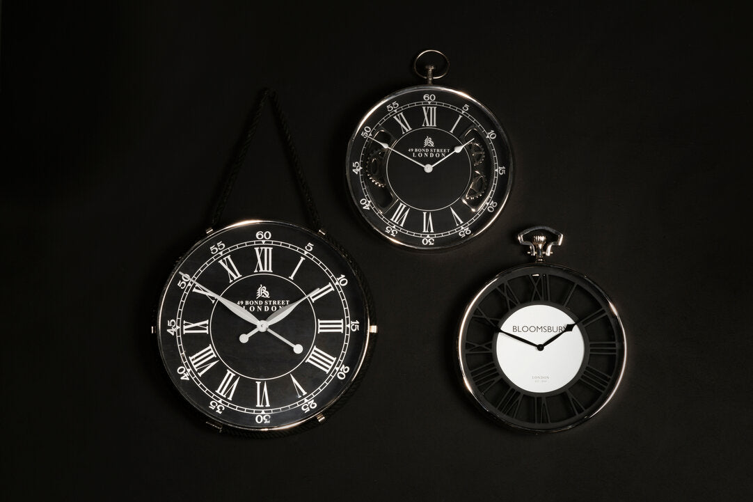 It creates a monochromatic contrast with the white round dial and matte black numerals. The spade needles coordinate to the roman style numerals and add to the vintage aesthetic of the clock.