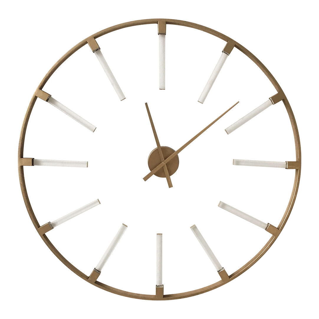 This wall clock has a ring design metal frame in a sleek gold finish with long hour pointers. The pointed needles complement the slim accent of the clock and give it a stylish look.