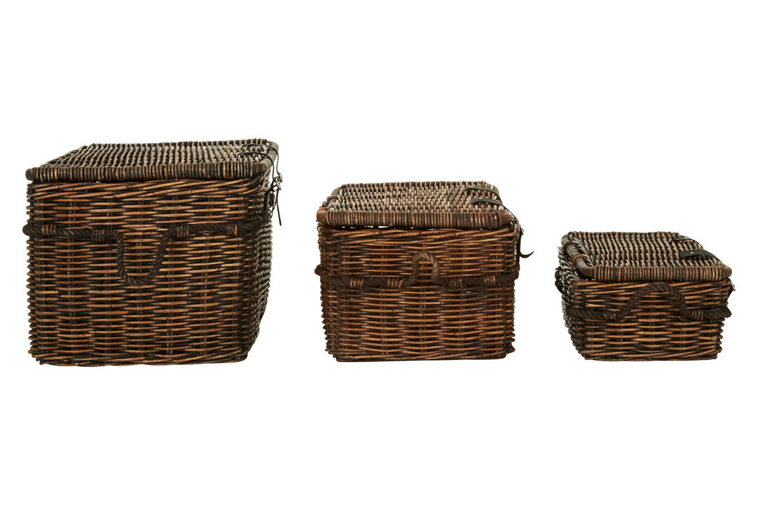 Hand woven from antique brown Kubu rattan, these rectangular boxes are complemented by matching lids which feature buckled strap closure. Each of these stackable boxes has rope detailing at the middle with raised looped handles on the sides.