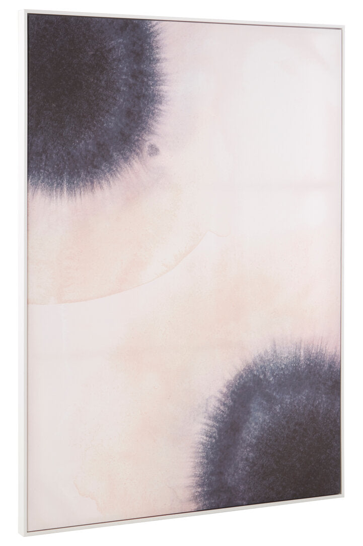 The canvas is held within a slim frame crafted from natural wood. Light pink is used as a base colour, with slightly shifting tones that accentuate the dandelion-like forms at each end. Display it landscape or portrait.