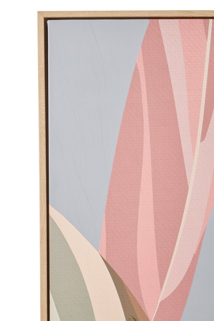 This exquisite artwork showcases a botanical design with overlapping leaves in soft pink, beige, blue, and earthy tones. The oil finish enhances the depth and texture, adding a contemporary accent to its abstract composition.