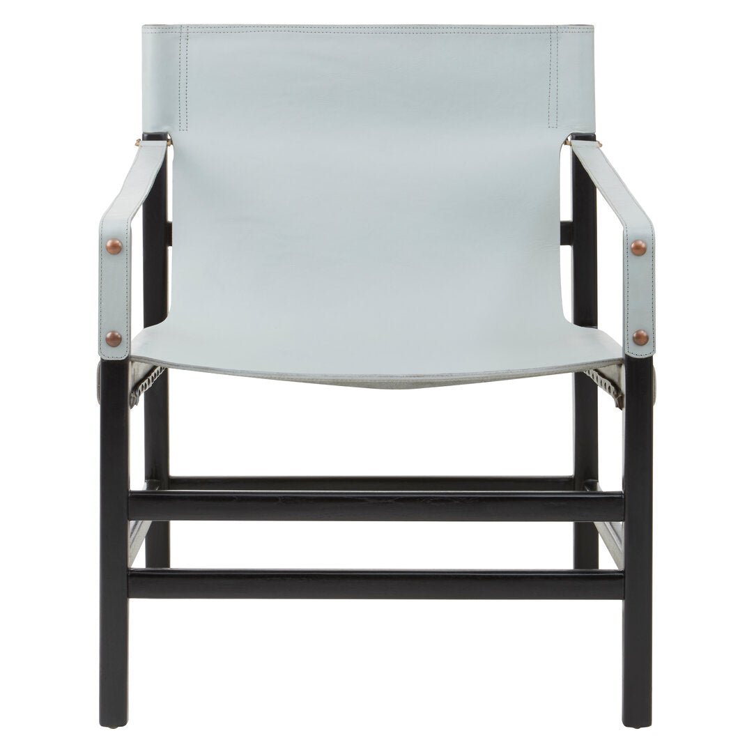 The Kendari chair seat and backrest are formed from a sling crafted from soft leather. The leather has a grey finish which creates a contrast with the frame. Crafted from natural teak wood, the frame utilises simple design lines that contribute to the chair's modest aesthetic. Black leather arms are held in place by copper coloured studs."