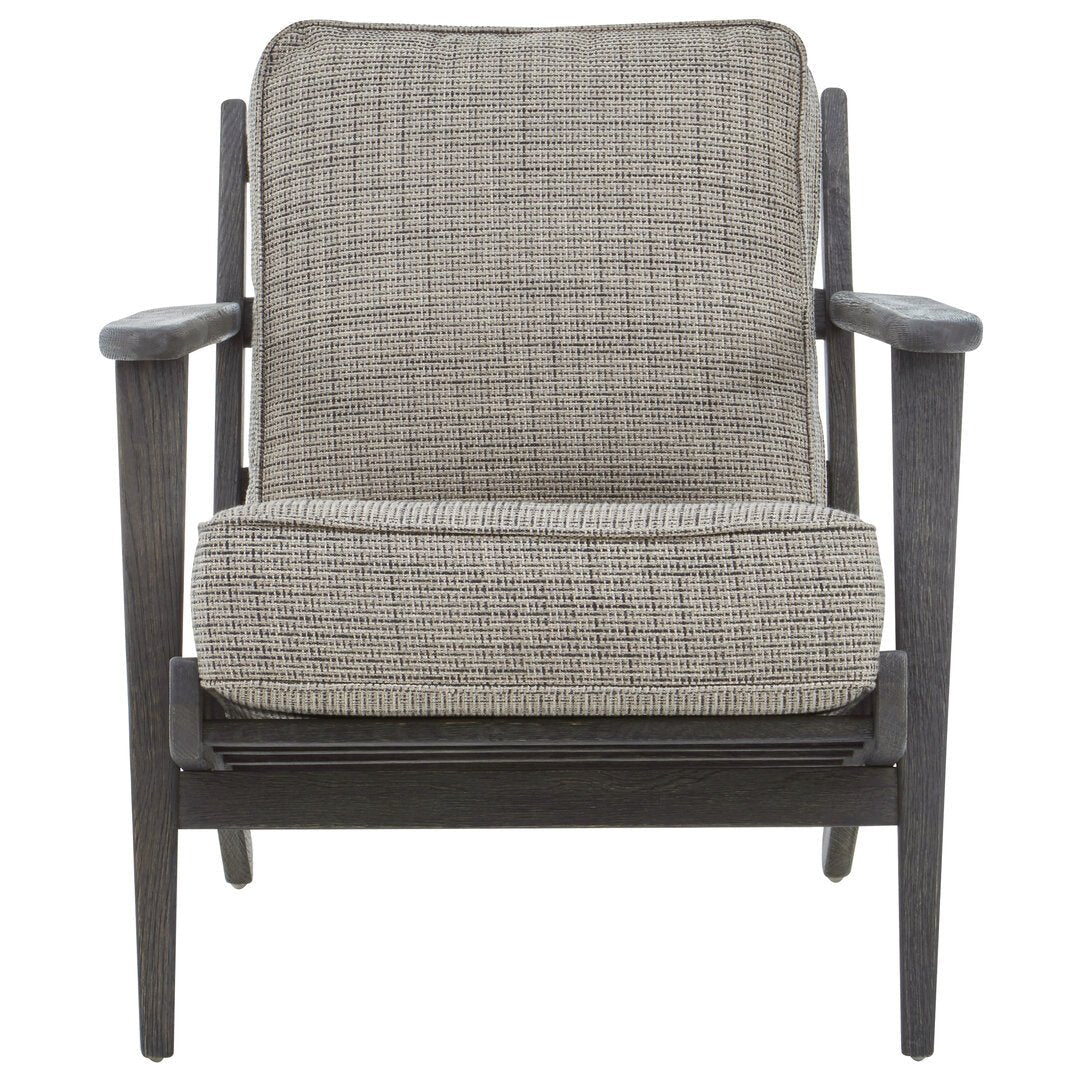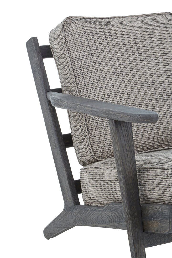 This striking accent chair pairs the geometric elegance of a black-finished oak wood frame with a soft, inviting texture provided by the deep-seated tweed upholstery. Its design, characterised by straight, tapered lines and comfortable cushions, offers a sophisticated and timeless blend of natural material and classic fabric texture.