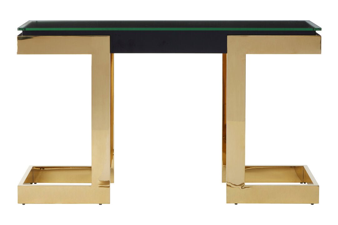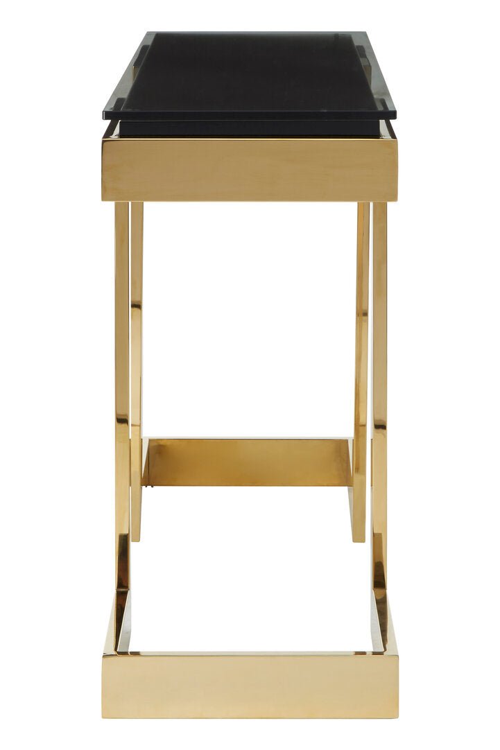 This luxurious console table makes a striking statement with its minimalist yet opulent design. It features a sleek, rectangular dark glass top, which rests atop two gold-toned metal legs. The legs are designed in a bold, geometric shape, providing robust support and exuding contemporary glamour, while a dark panel beneath the glass adds to its sophisticated aesthetic.