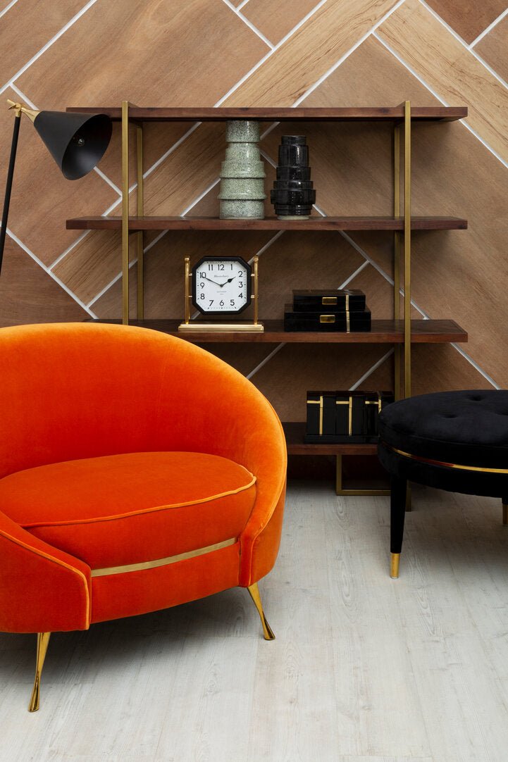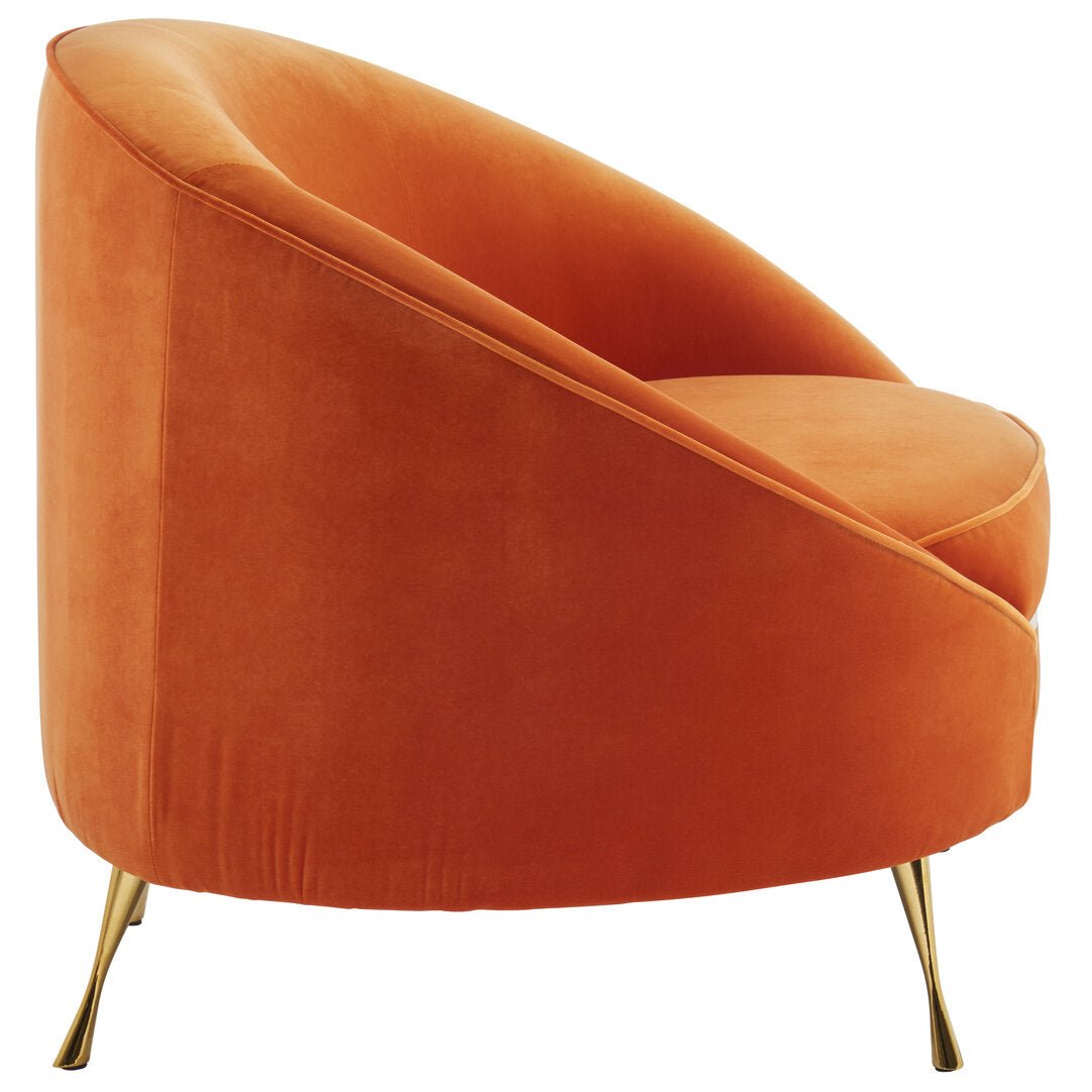 Upholstered in retro orange velvet, this chair will make a bright and colourful statement with its vivid shade. It has a curved backrest and seat cushion in thick padding for optimum comfort. The brass finish angled legs contrast the rich metallic detail.