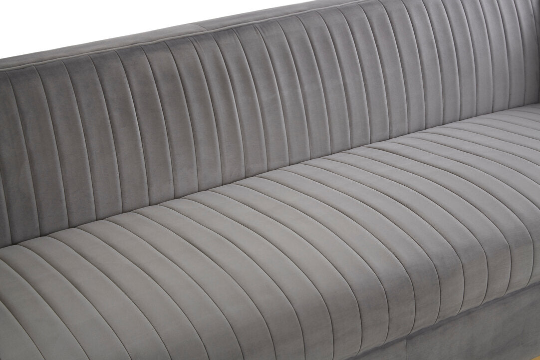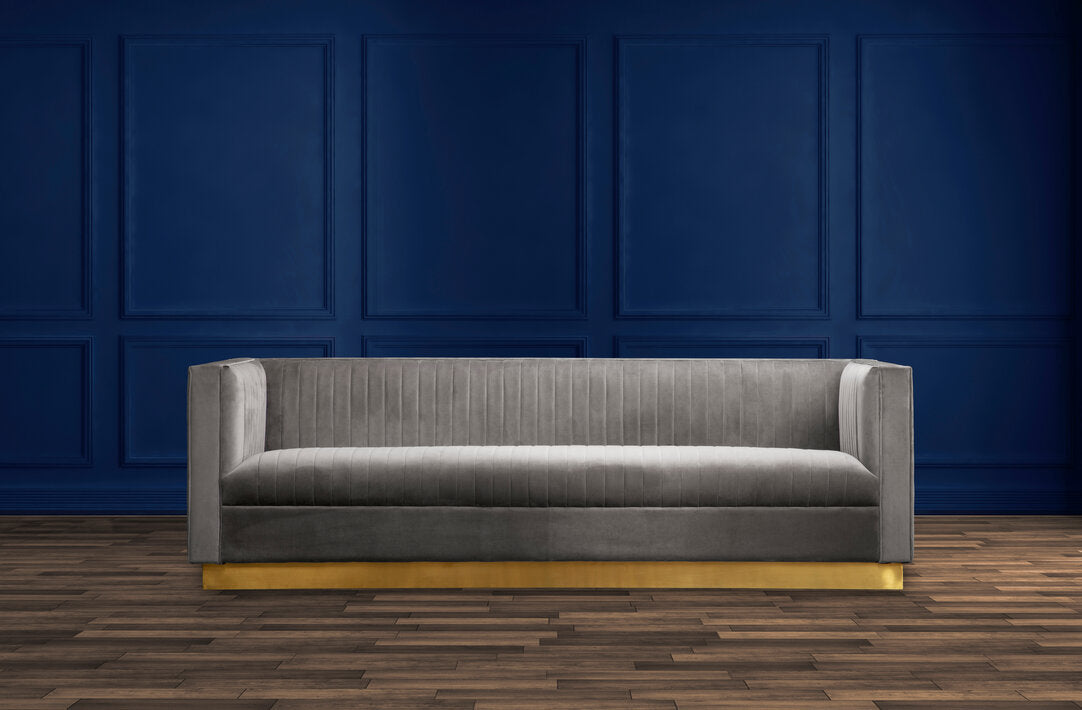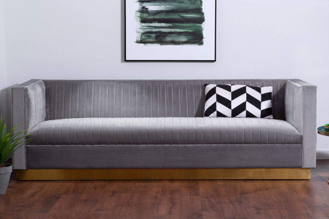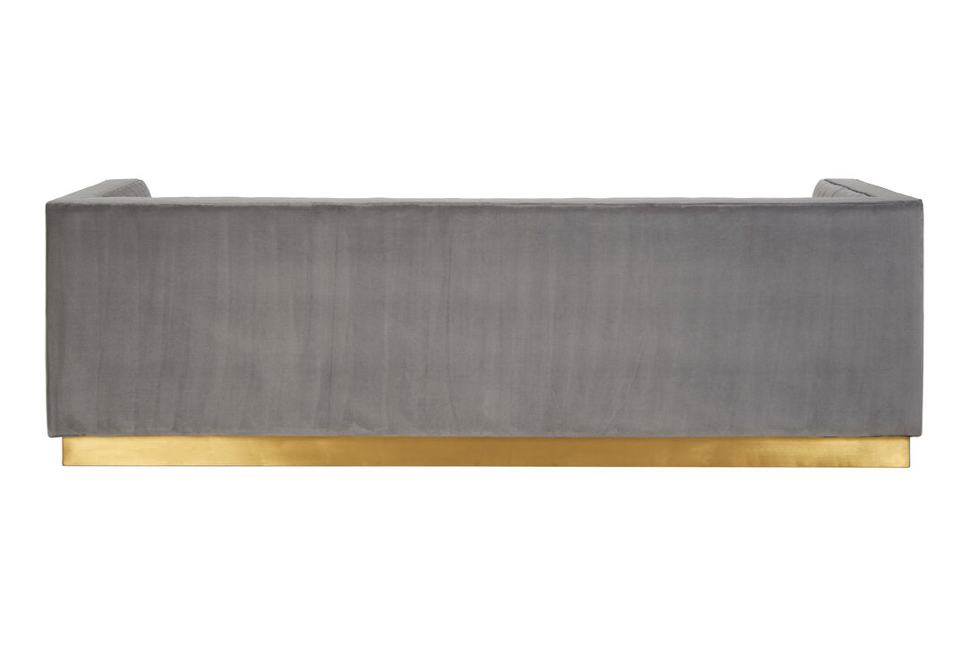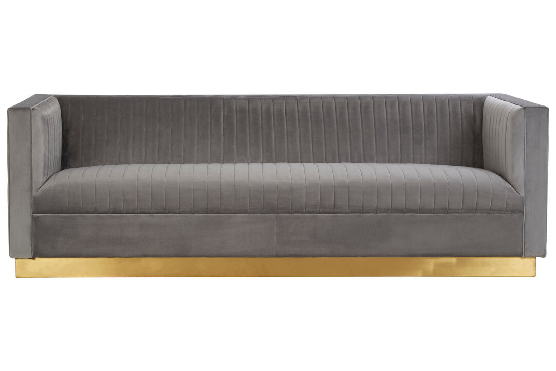 This 3-seat sofa will be a sophisticated addition to a contemporary home with its clean lined design in soft grey velvet upholstery. Channel tufting lends a touch of tactile texture to the padded seat and backrest. The warm metallic base contributes to the glam appeal of this statement piece.