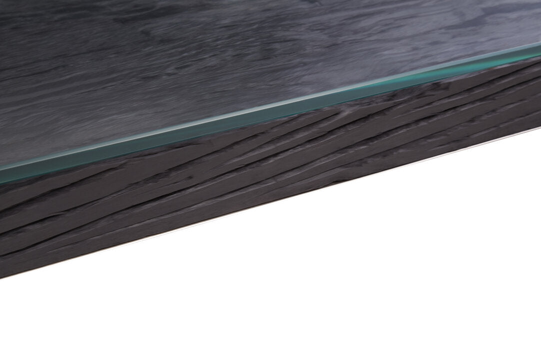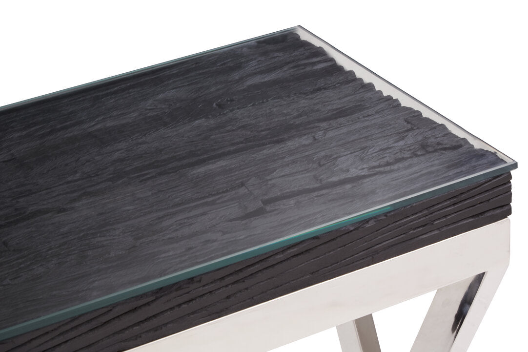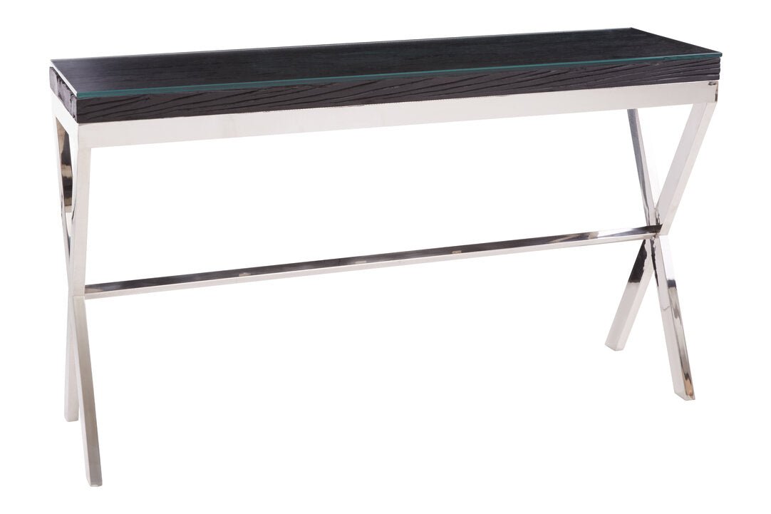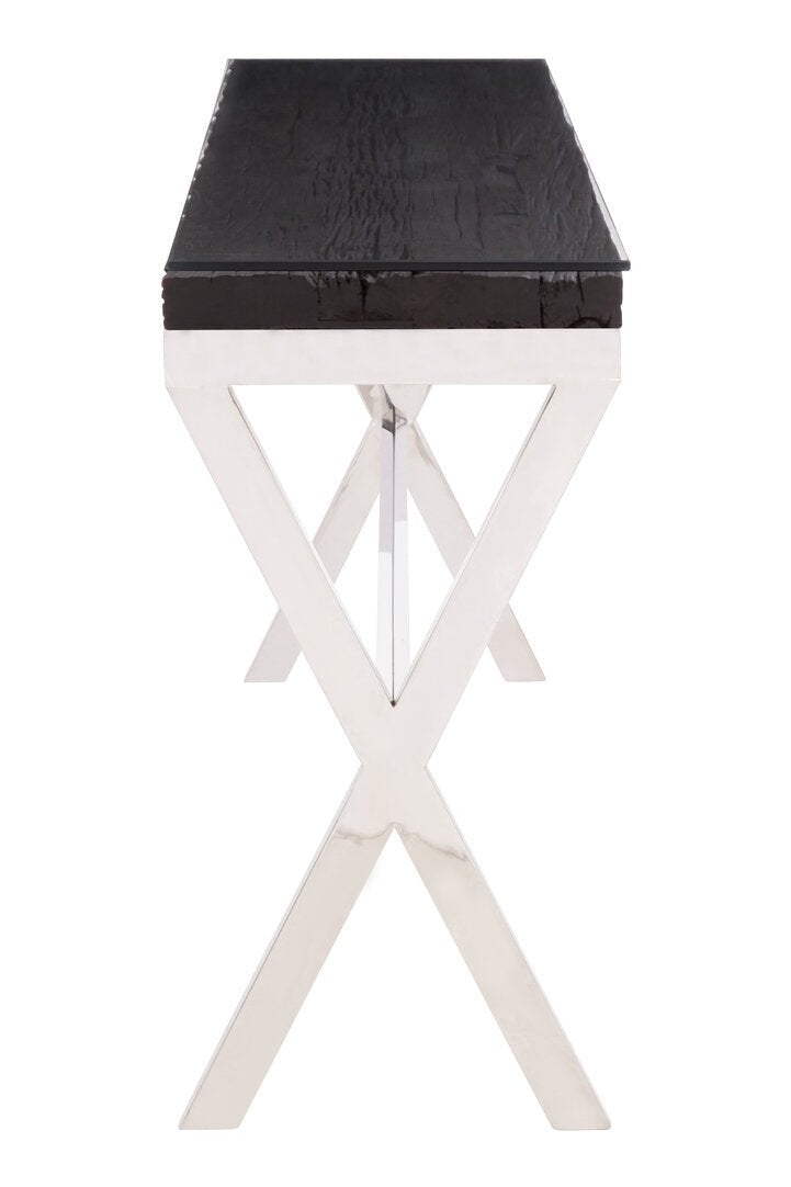 This console table has a silver stainless steel frame with crossed legs to provide stability. The frame combines with a black natural wood top with glass, creating an elegant look suited for showcasing luxe items.