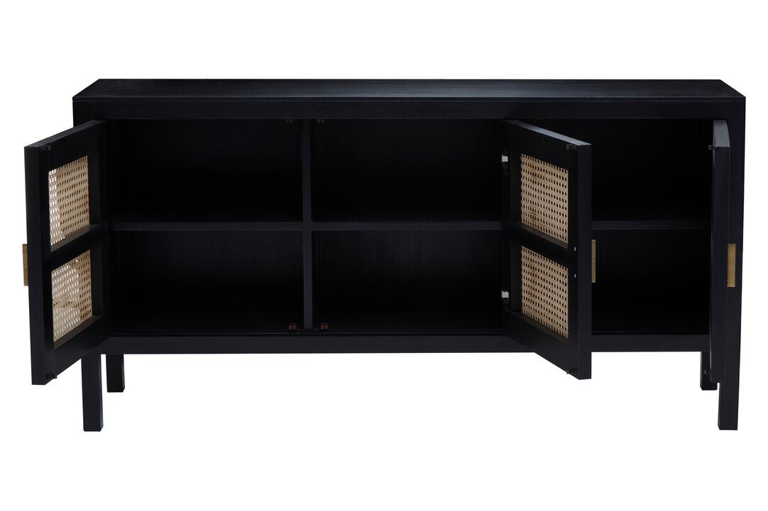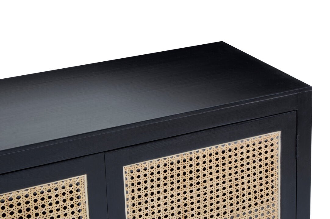 This stylish three-door sideboard features a sleek black finish. Its defining characteristic is the intricate rattan webbing panels set into each door, providing a contrasting natural texture.