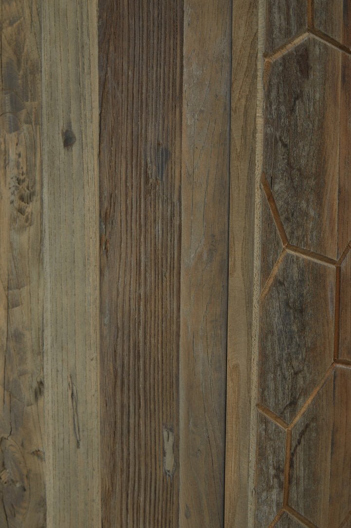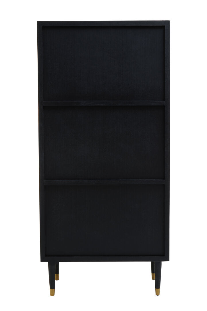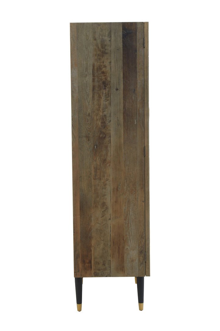 Expertly handcrafted with recycled elm wood, this cabinet has a carved effect wood face that accentuates a sense of texture with the geometric patterns. Black finish wooden legs contrast the natural accent of the understated top.