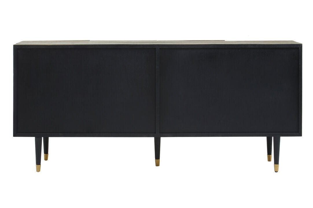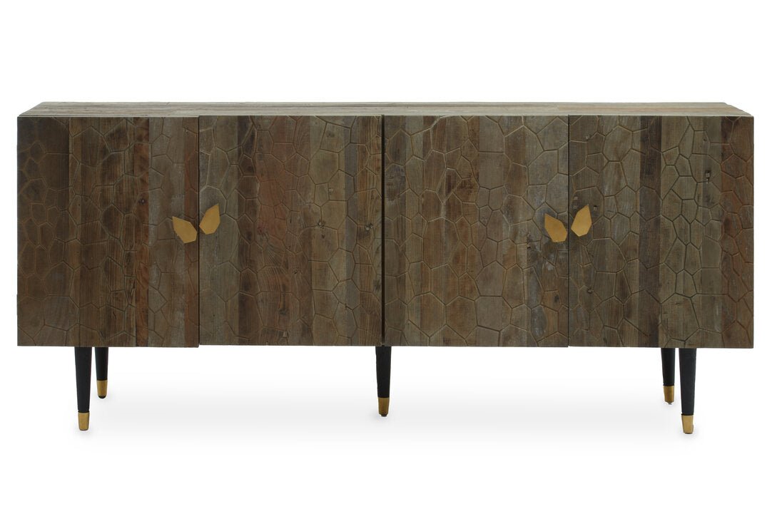 The Malay sideboard is expertly handcrafted from recycled elm wood and features a carved effect of abstract geometric patterns on the doors. Black finish wooden legs contrast the natural accent of the understated top.
