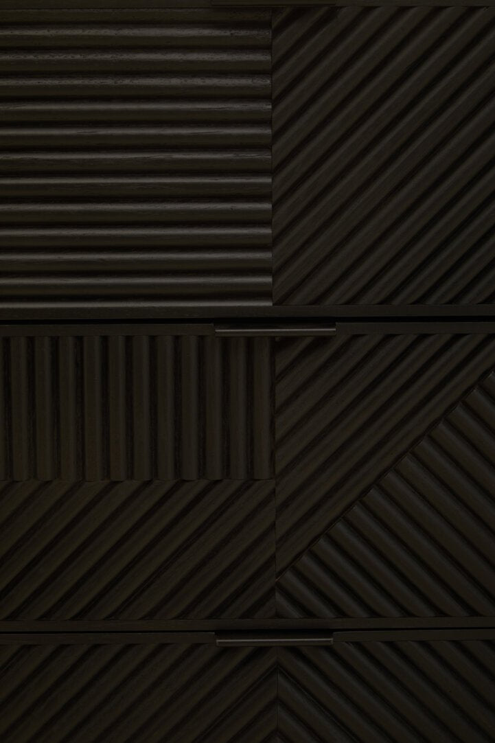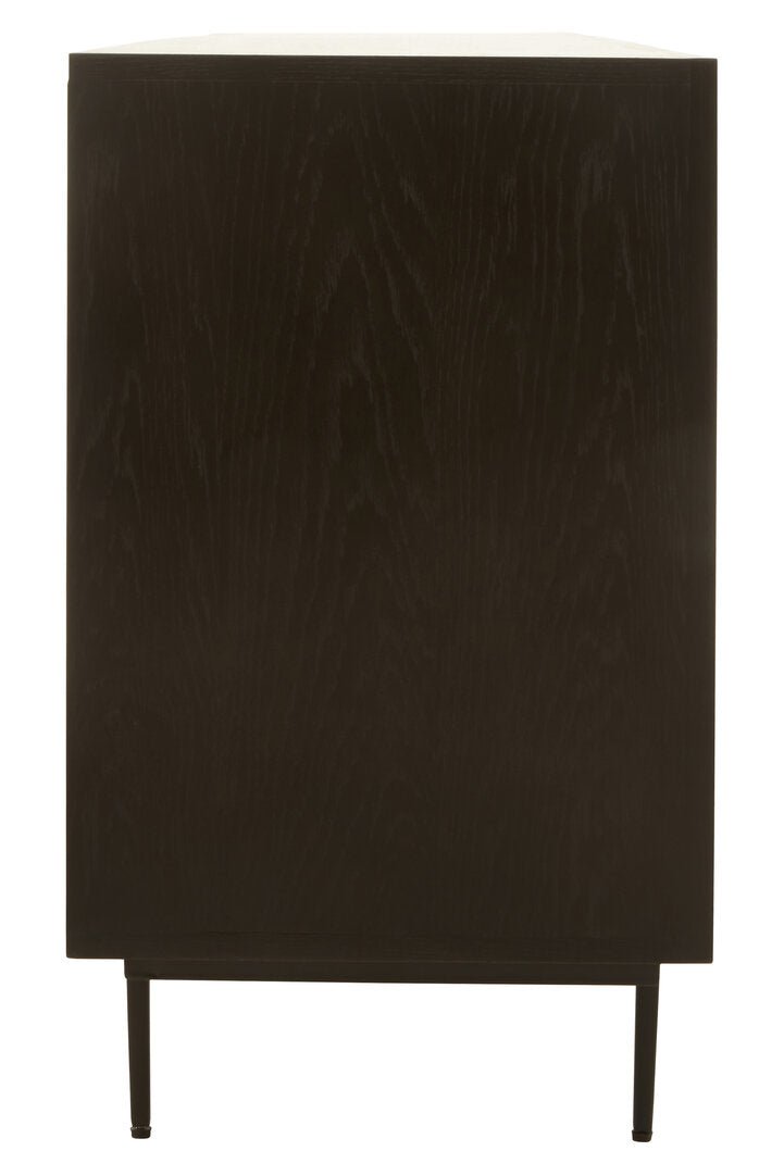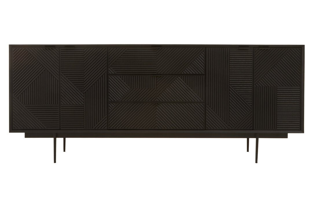 The Jakara sideboard is modern and functional, featuring a unique, hand-carved geometric pattern on the fronts of its drawers and cupboard doors, adding a striking textural element. The black finish wood is complemented by minimalist black handles and supported by a sleek black metal base with tapered legs, offering a sophisticated storage solution for any room.