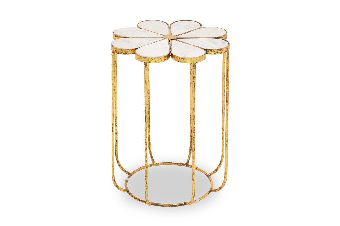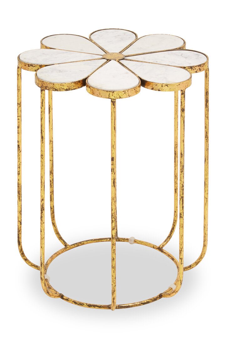 This cocktail side table features hand hammered petals combining to form a polished white marble top. Sleek gold wires descend from the floral contours to create an elegant base openwork.