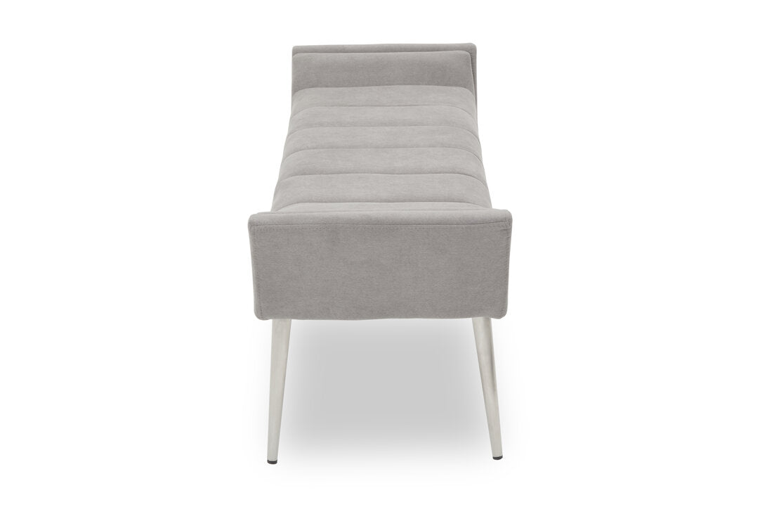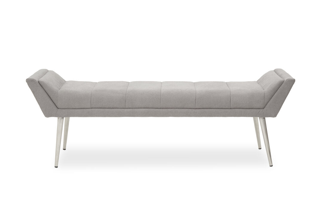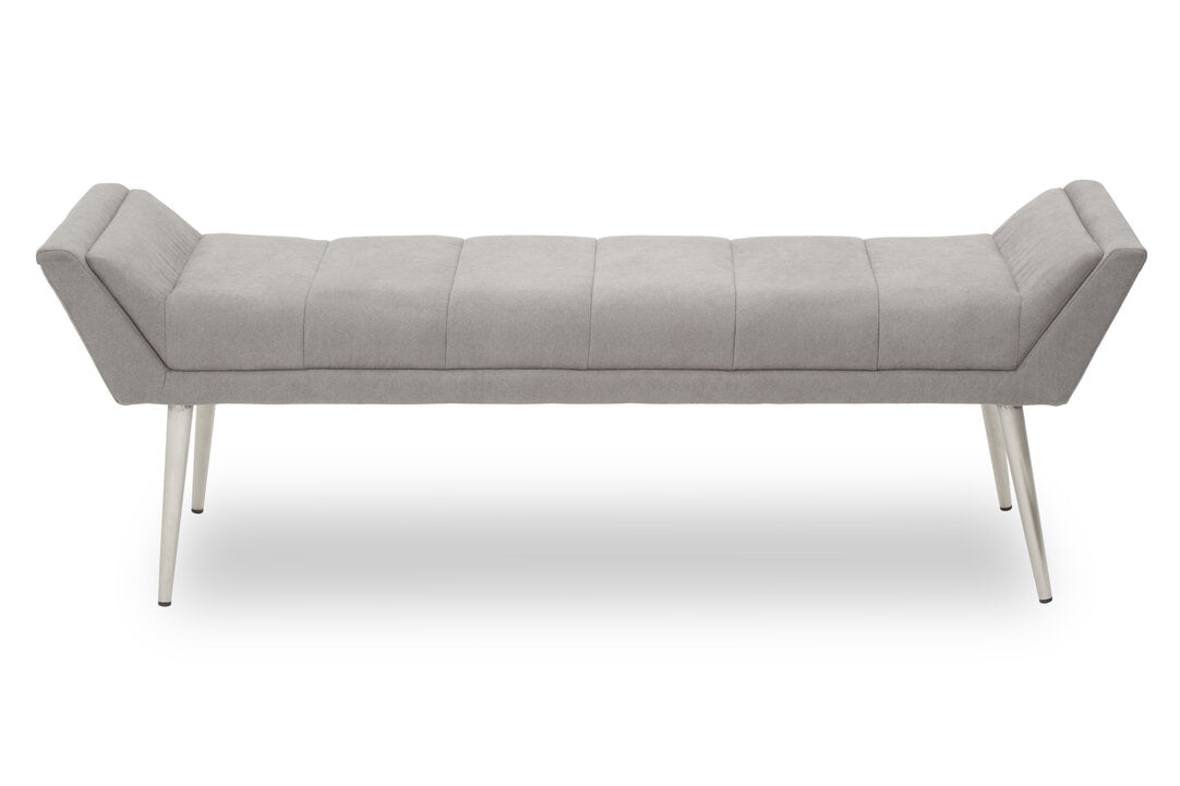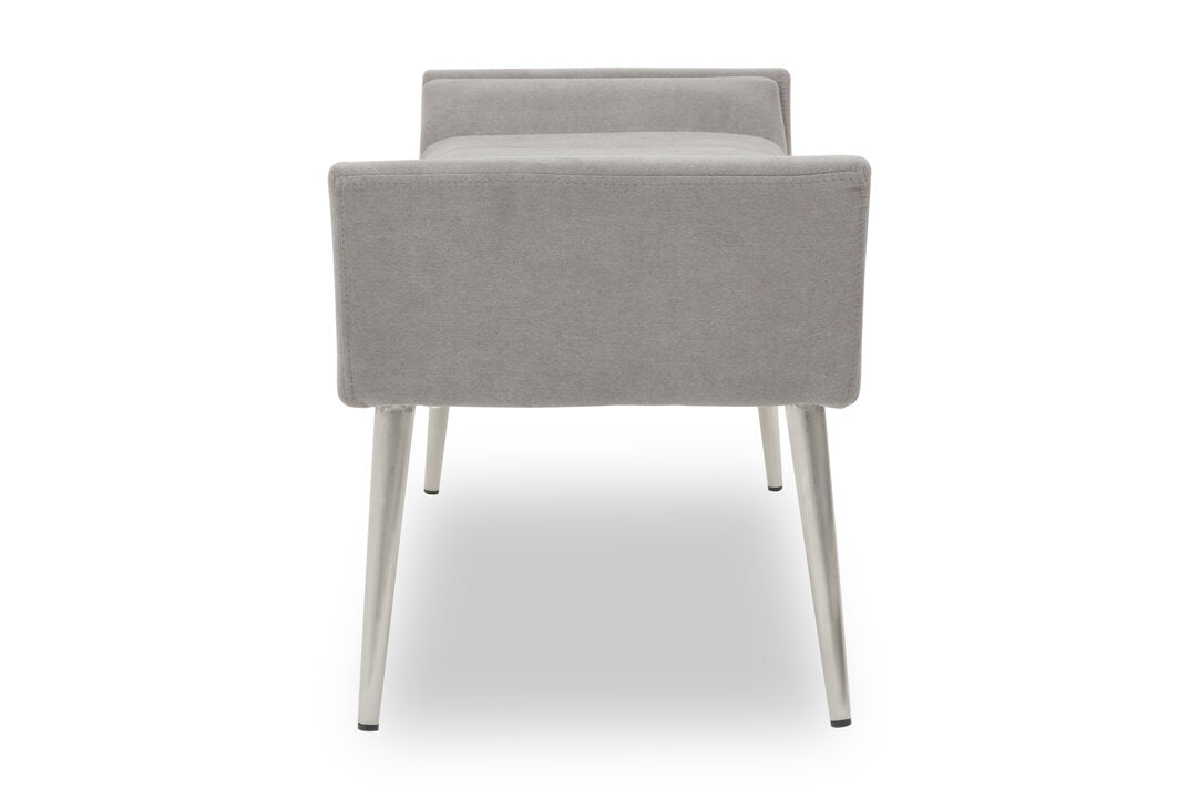Upholstered in grey fabric with sumptuous padding, this bench will look sophisticated with the clean lined seat and sloping arms. A minimal channel detail adorns the seat and complements the angular silver finish legs.