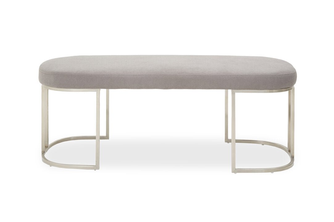 This bench boasts grey fabric upholstery enhanced with high density sumptuous padding. The rectangular seat has gentle curves that coincide with C shaped sides in the brushed silver finish.
