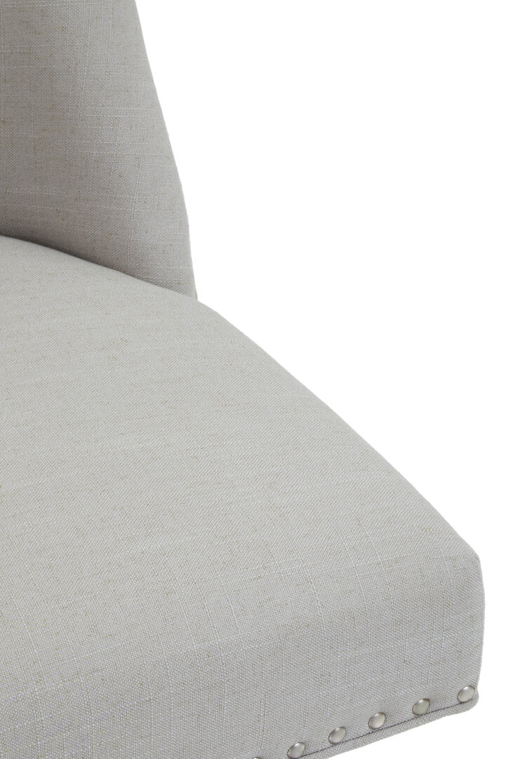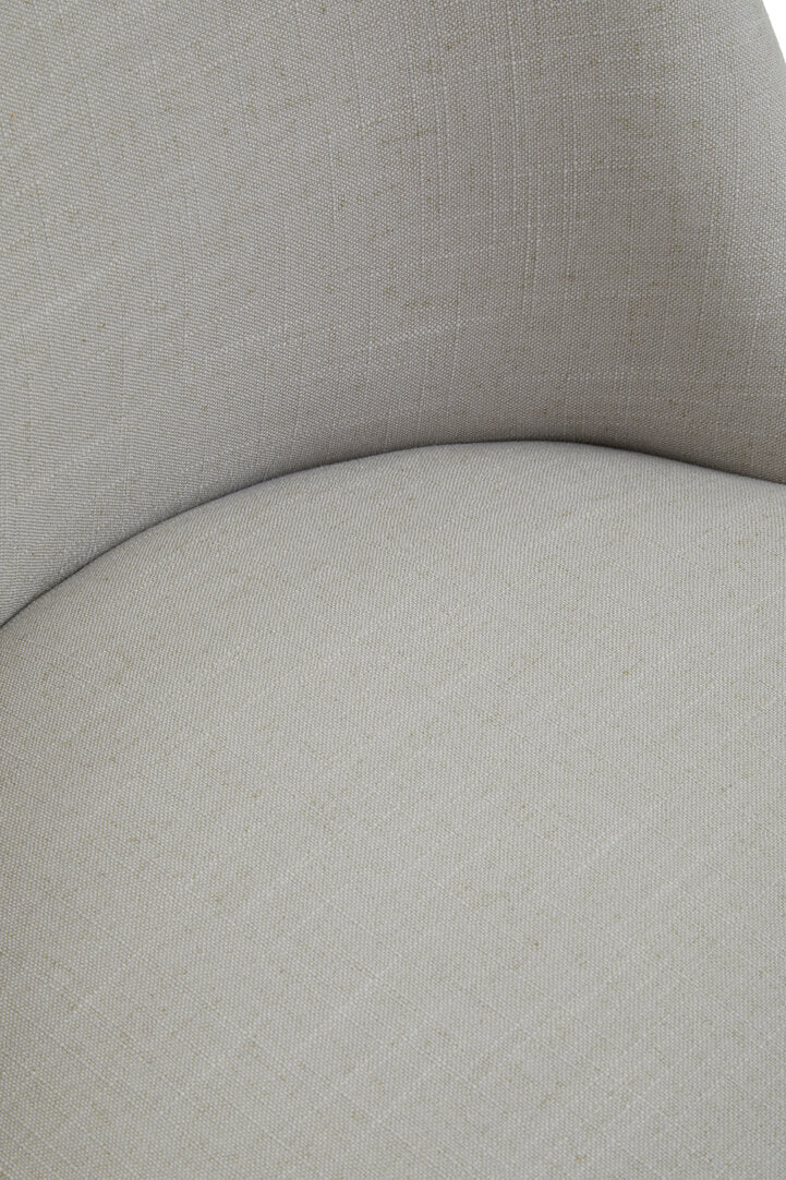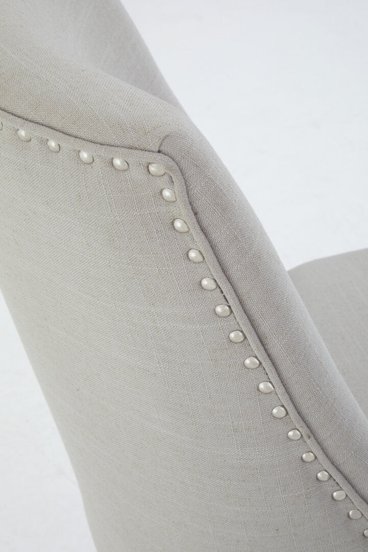 This chair is upholstered in plush natural fabric with dense foam padding to provide a cosy seating experience. The stud trim detail at the front adds a contemporary appeal to the design, and the swivel wooden base with castors offers swift manoeuvrability.