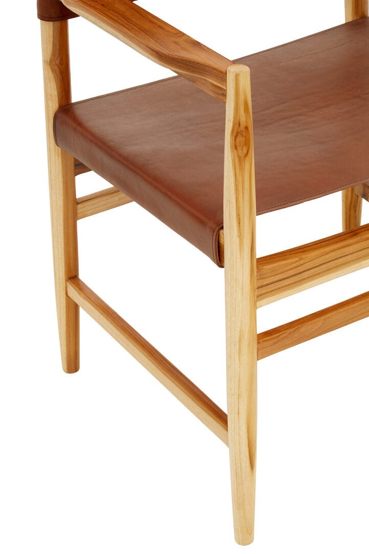 The frame of this chair is handcrafted expertly from teak wood, and the natural tonal variation will lend a rustic charm to the area. The clean-lined frame of this chair is wrapped with antique brown cow leather to ensure a relaxed sitting experience.