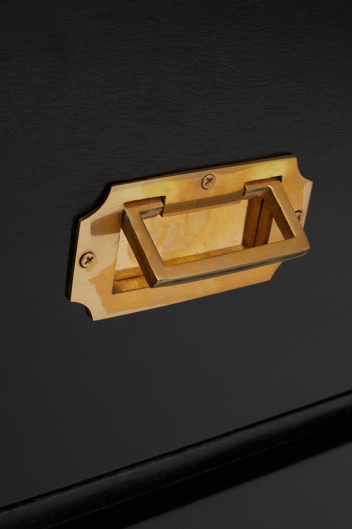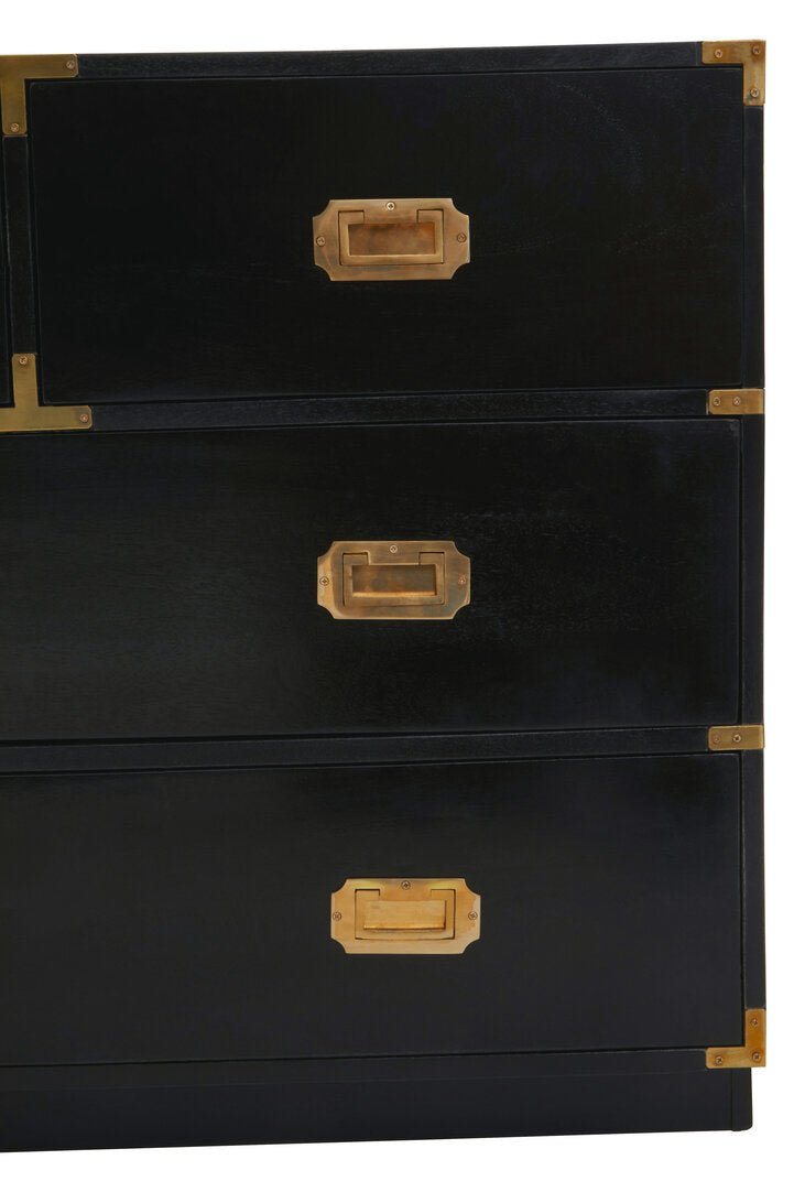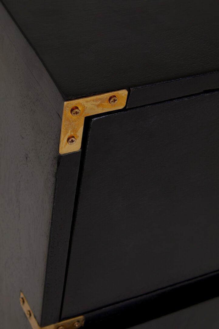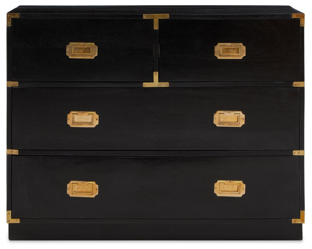 The Sarter black mango wood chest is a decadent addition to you decor. Four large drawers provide ample storage space, while the gold finishings elevate the chest.