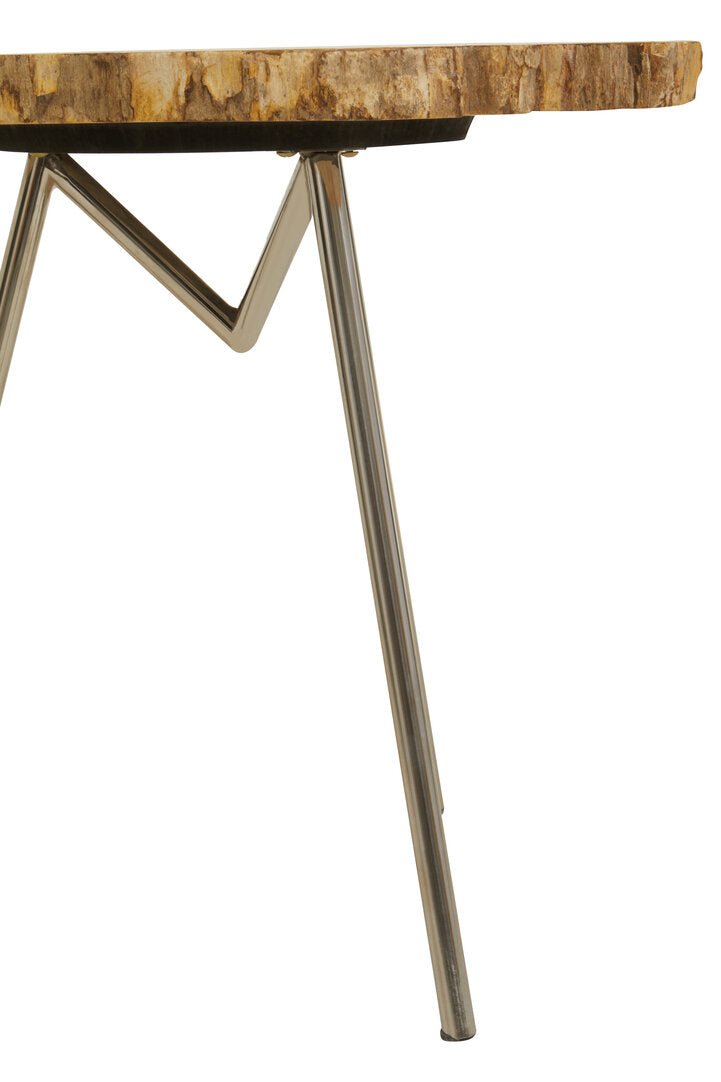 The large Relic Side Table is a contemporary piece with a unique design. The tabletop is made of petrified wood, which is fossilised and has a distinct pattern and naturall tones, making each table one-of-a-kind. The legs are crafted from stainless steel, creating an elegant contrast to the organic wood top. The table's design blends natural allure with modern sophistication.
