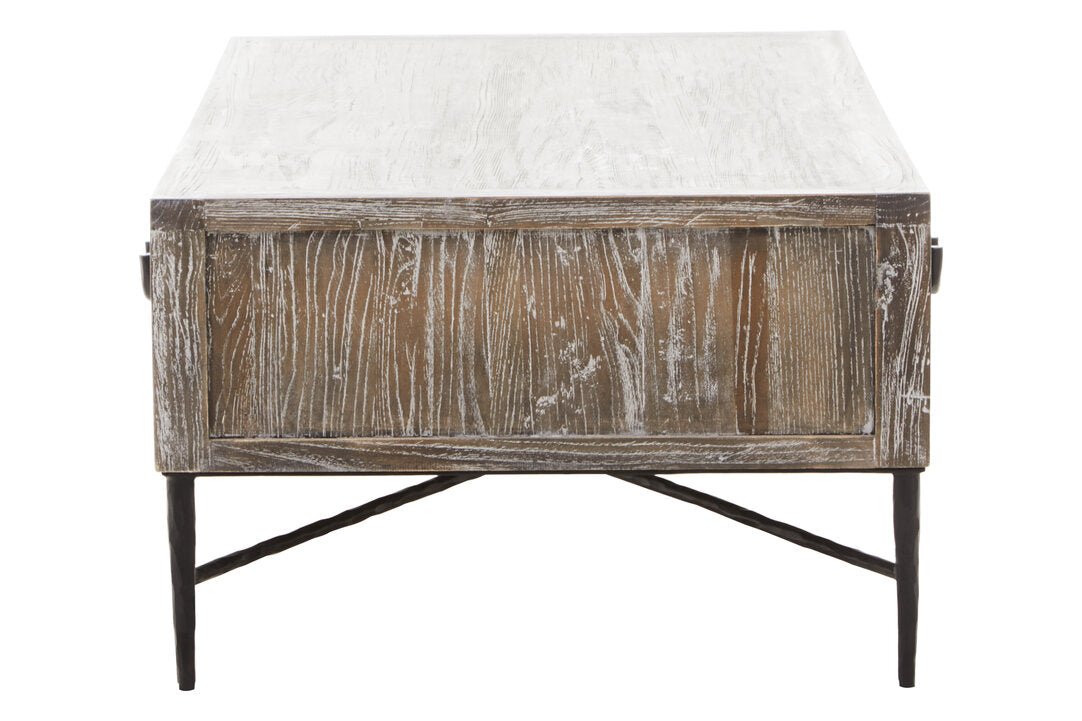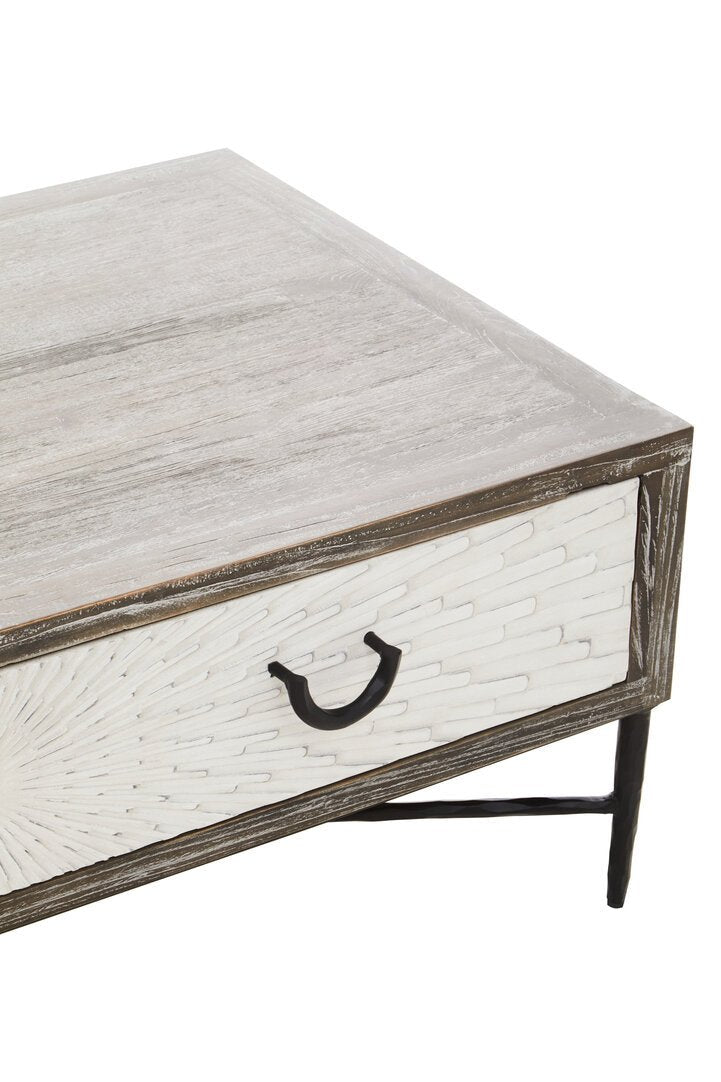 The coffee table combines modern elegance with rustic charm. Crafted from recycled elmwood in a dark mud grey finish, it features two textured drawers for ample storage. The antique iron legs add contrast and sophistication, enhancing its luxurious appeal in any space.