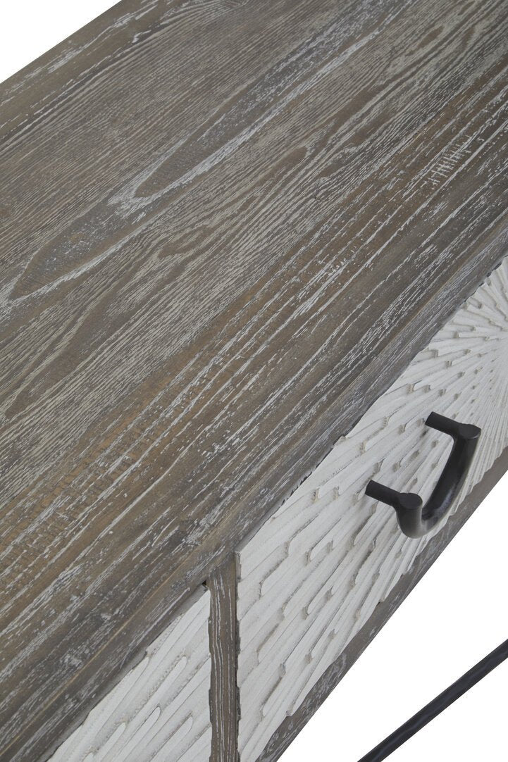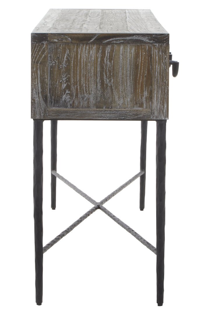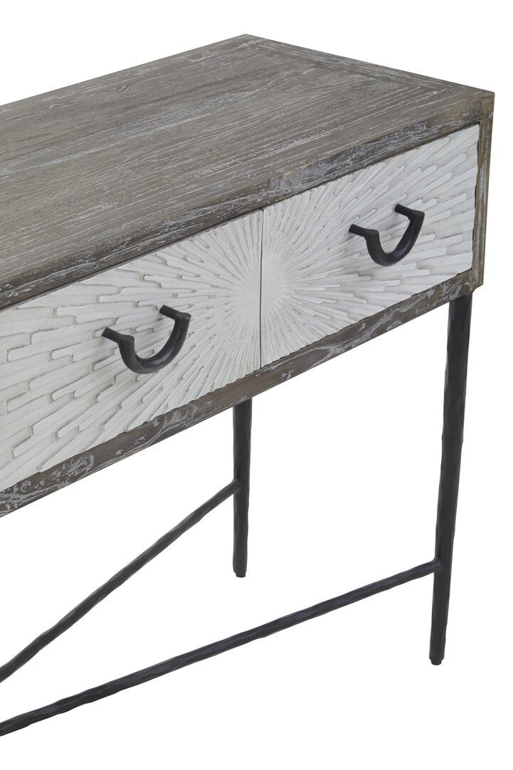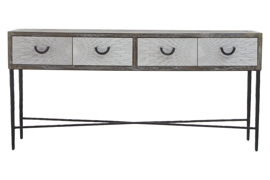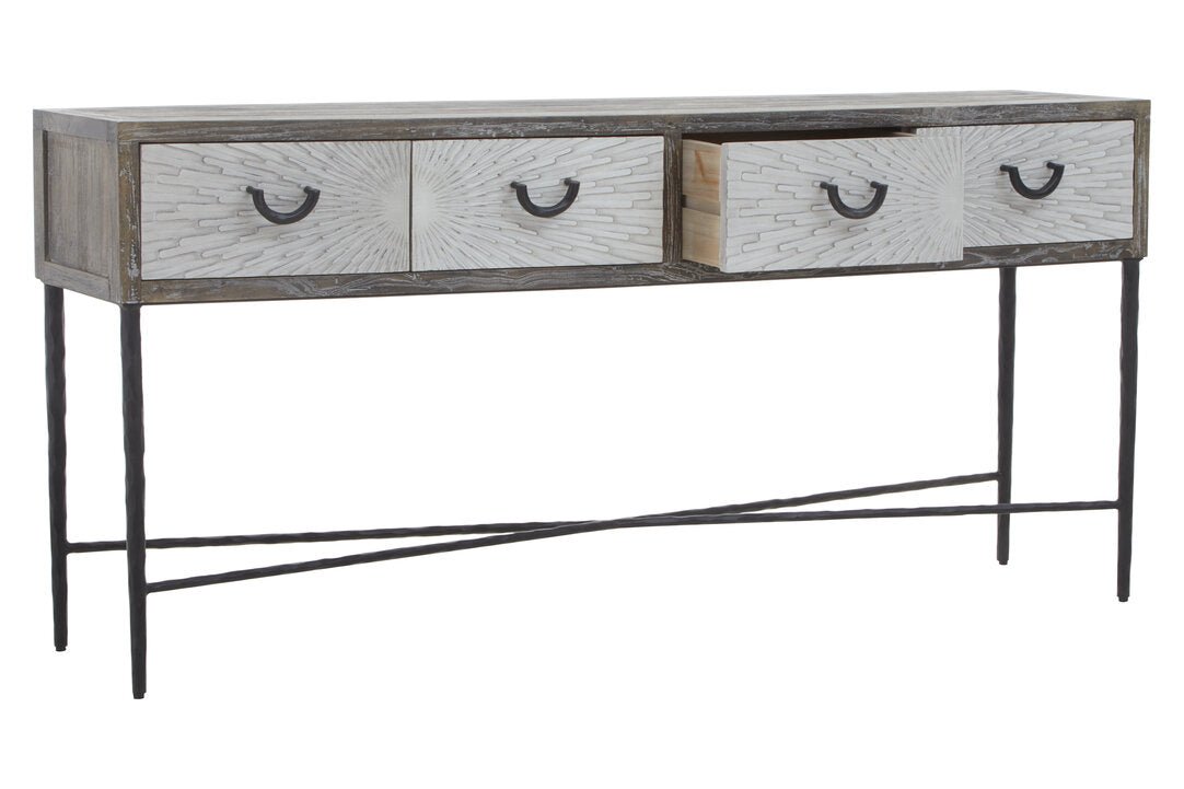 The console table combines modern elegance with rustic charm. Crafted from elmwood in a dark mud grey finish, it features four textured drawers for ample storage. The antique iron legs add contrast and sophistication, enhancing its luxurious appeal in any space.