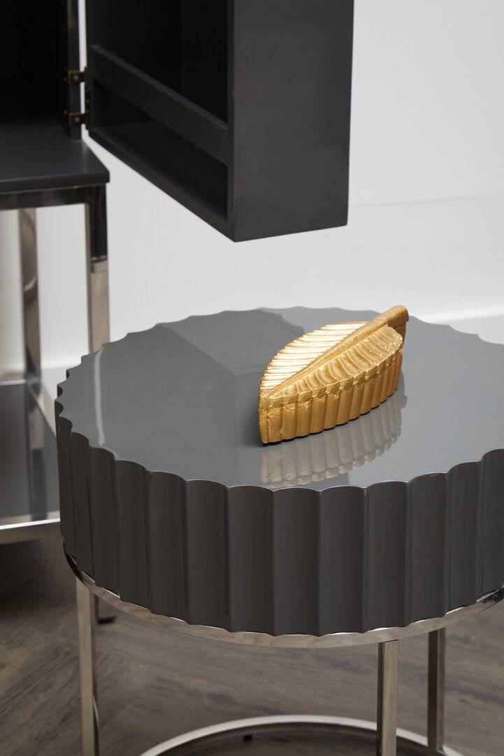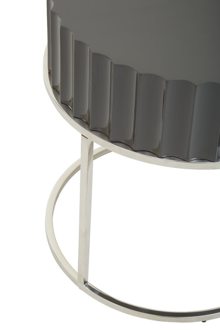 This is a modern and stylish side table with a sleek design. The tabletop features a round, high gloss grey finish with a beautiful fluted texture. It is supported by a minimalist and sturdy stainless steel base, creating a contemporary and elegant accent piece.