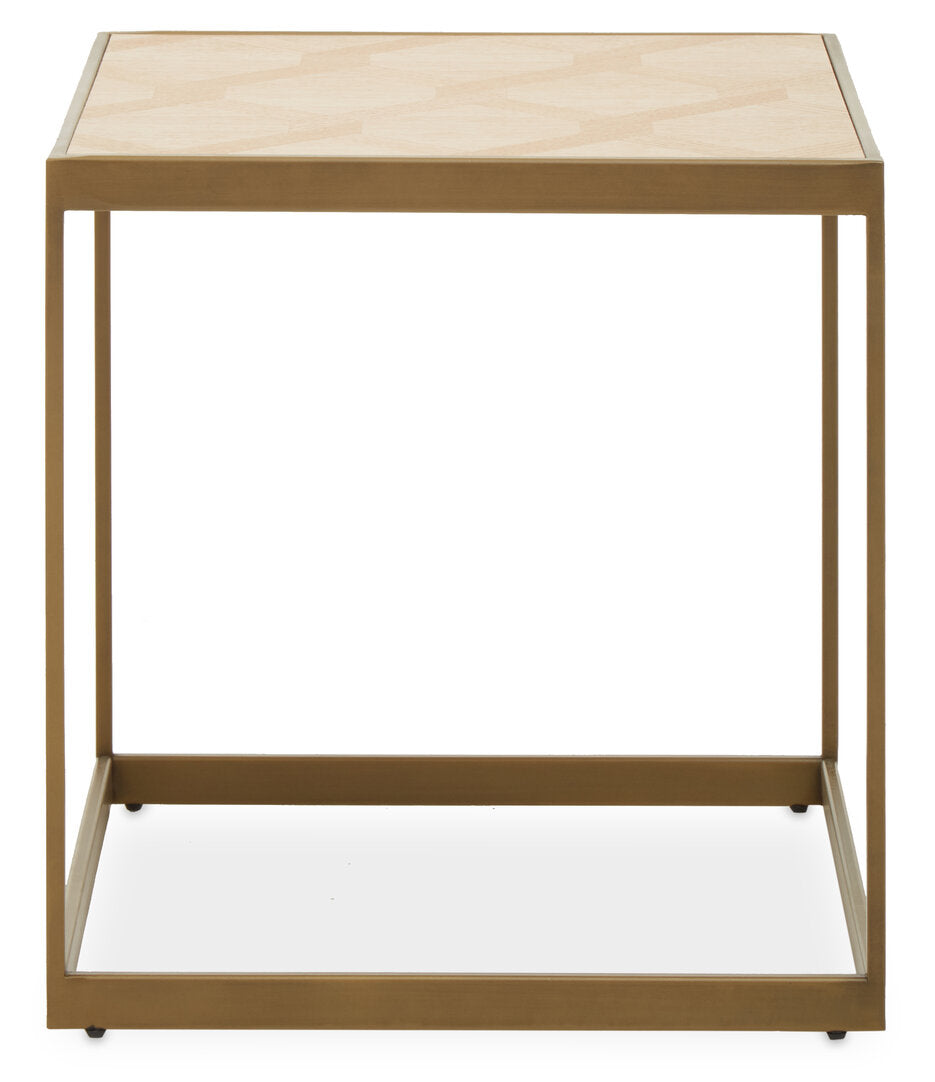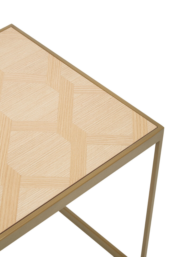 This small end table exudes elegance with a sleek wood top and steel frame. The open sledge base with a brushed brass finish and the oak veneer wood top elevate visual appeal.
