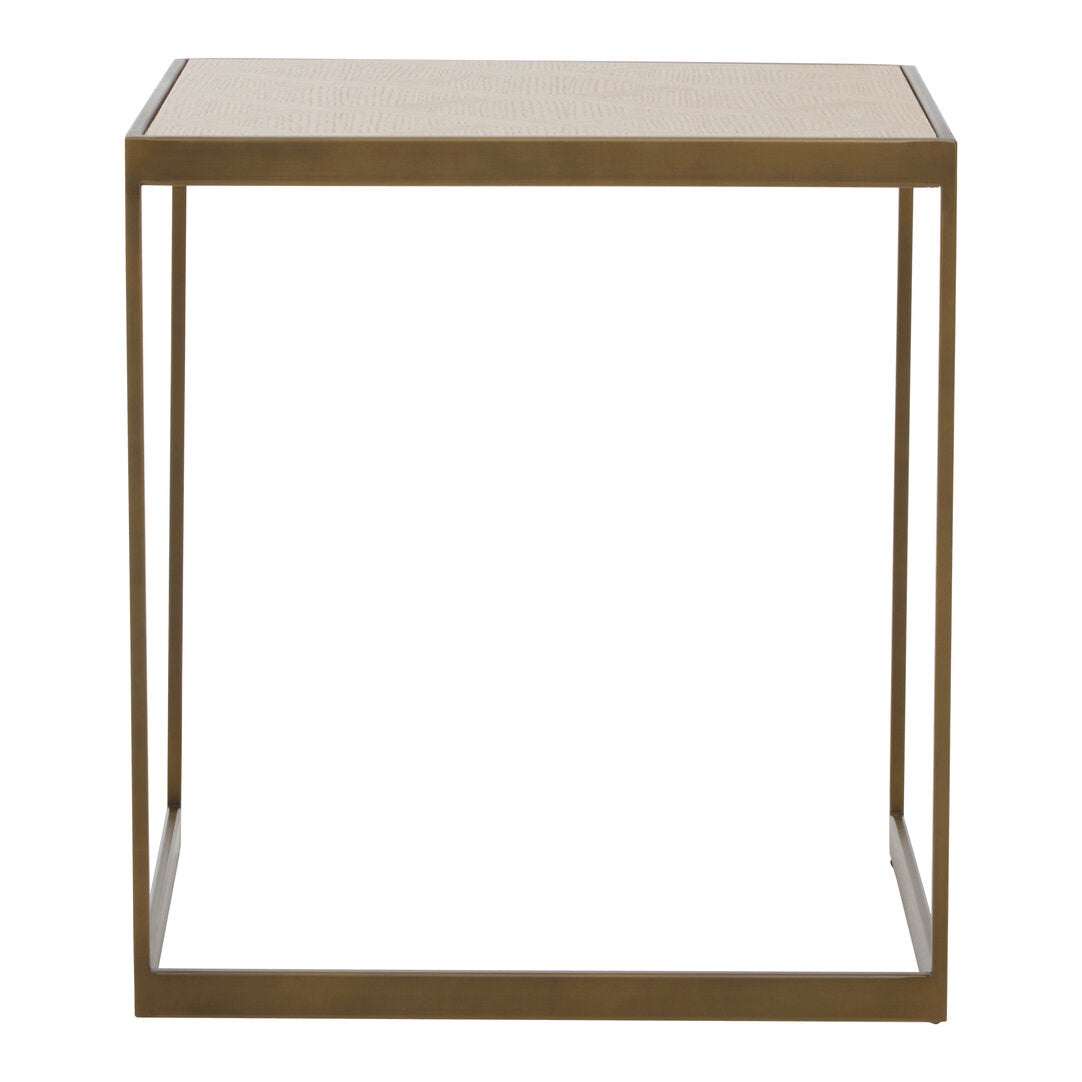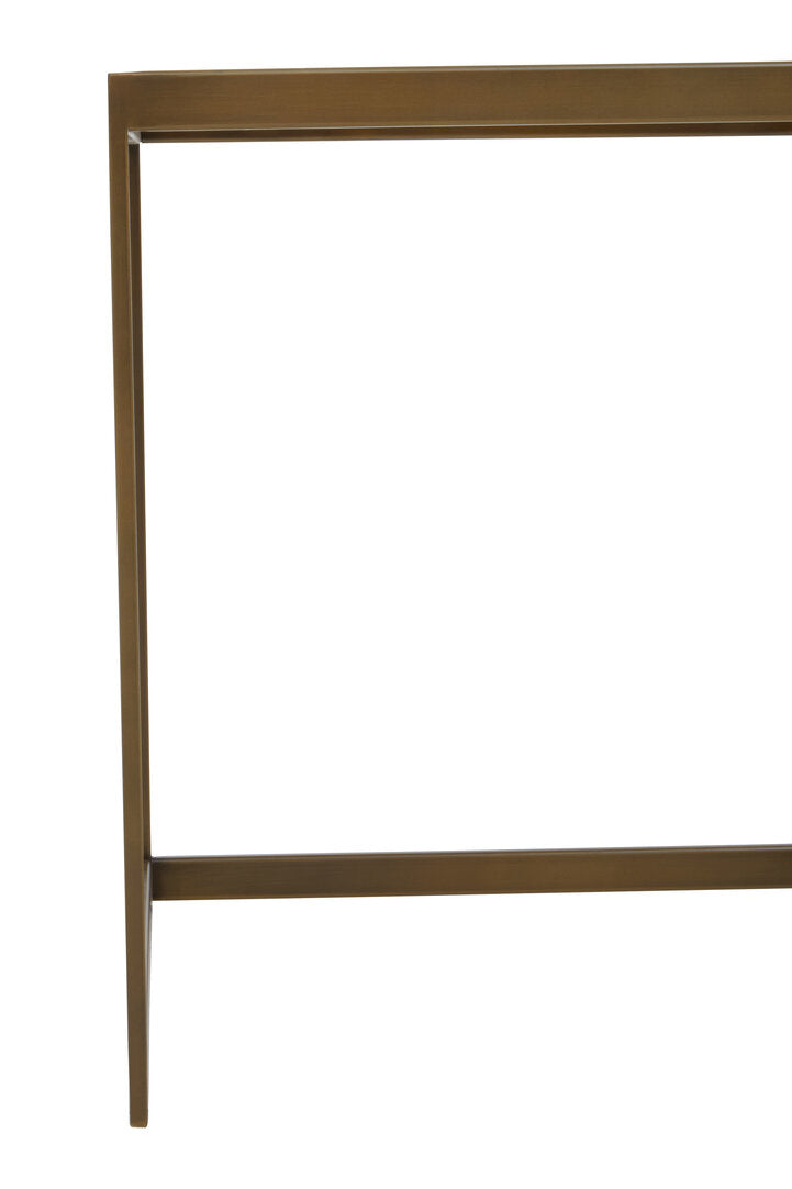 This is a modern and minimalist large side table with a simple, elegant design. It features a rectangular top crafted from oak veneer, which has a natural grain. The top rests on a sleek, open frame made of brushed brass, a perfect blend of natural texture and modern style.