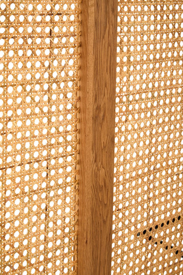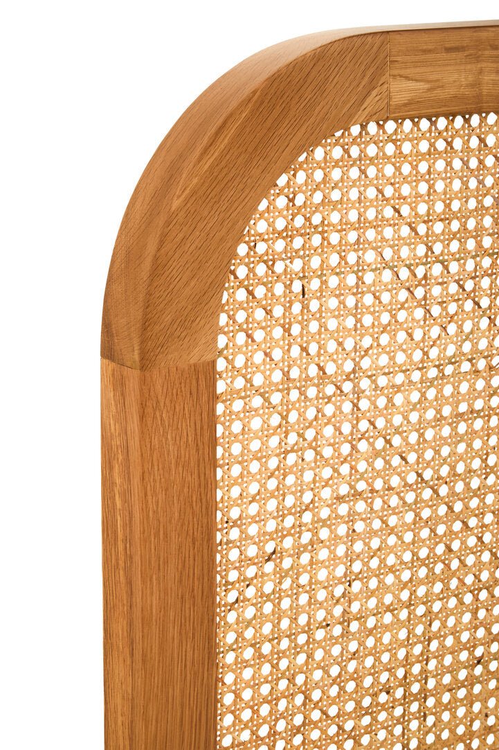 The Lyon double bed headboard combines minimalism with natural aesthetics. Crafted from oak wood, it features a gently curved frame complemented by woven rattan. The combination of warm oak hues and organic texture adds depth and character. This headboard blends with both modern and classic living spaces.