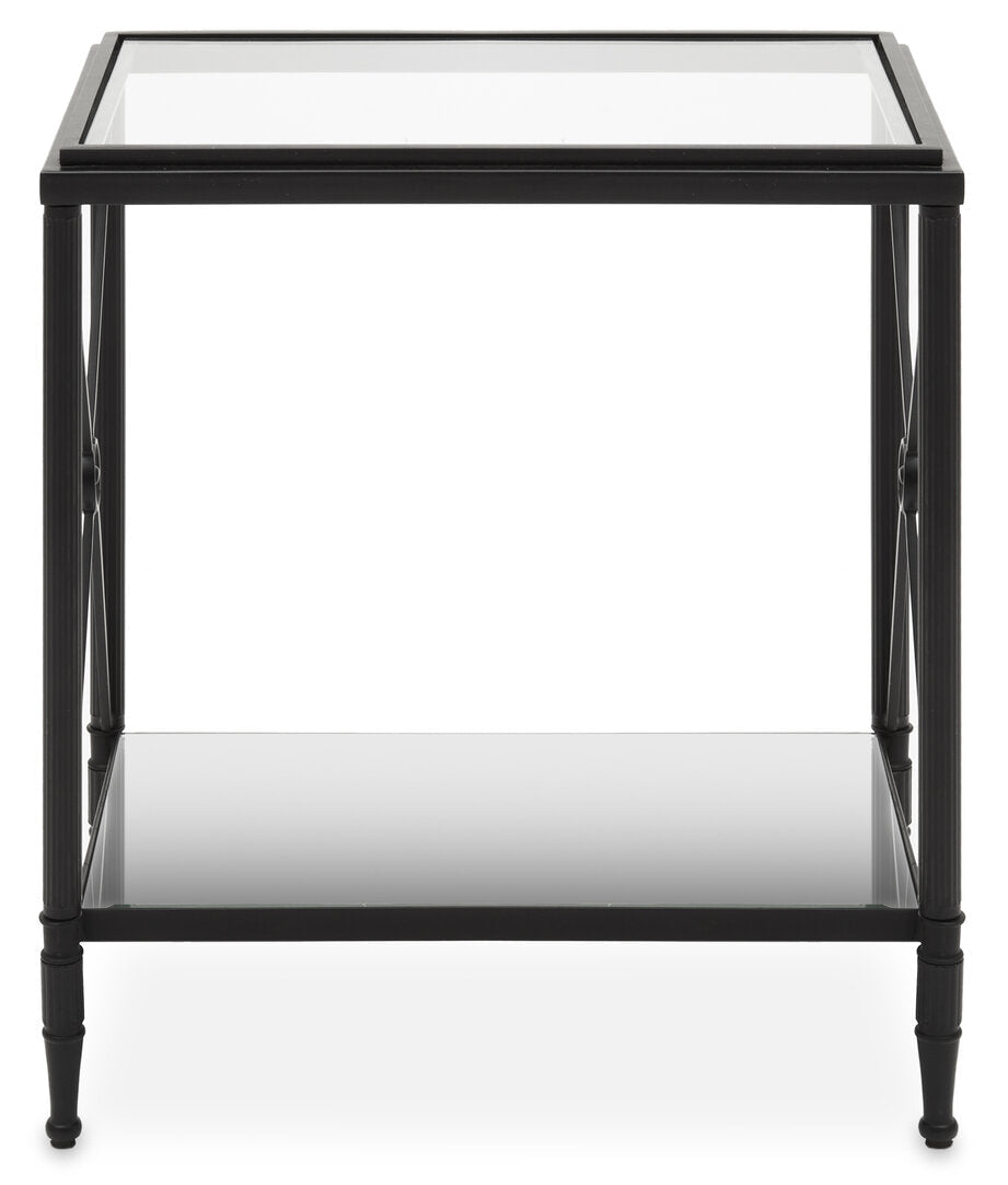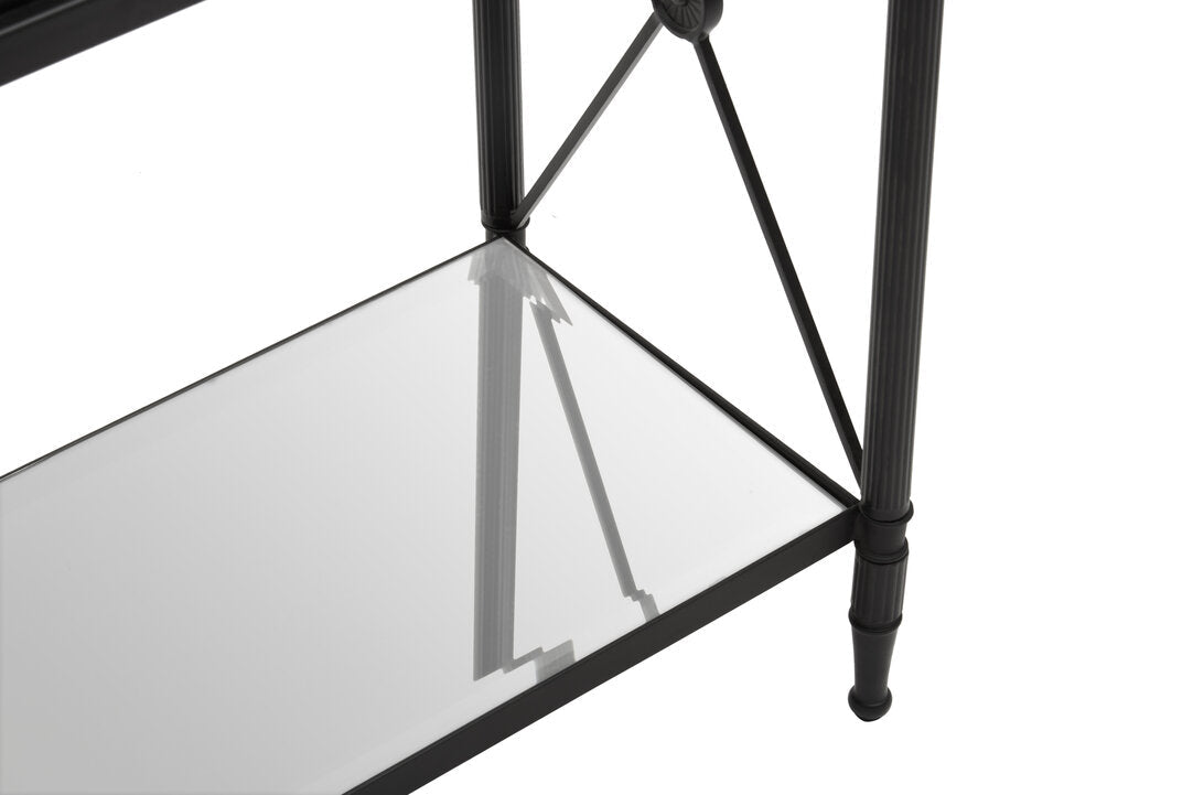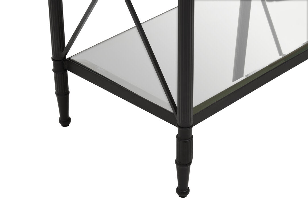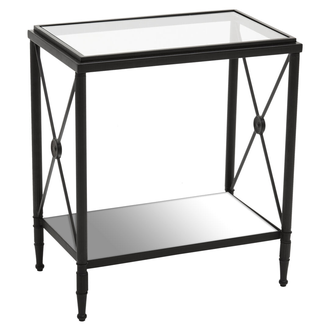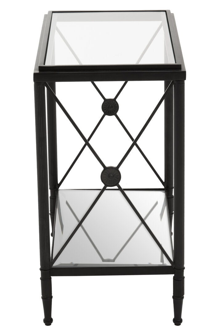 This side table has a rectangular metal frame in a black finish forming a monochrome contrast with the clear glass. Supporting two-tier glass levels, the frame features a cross design at each end which is connected with a floral motif.