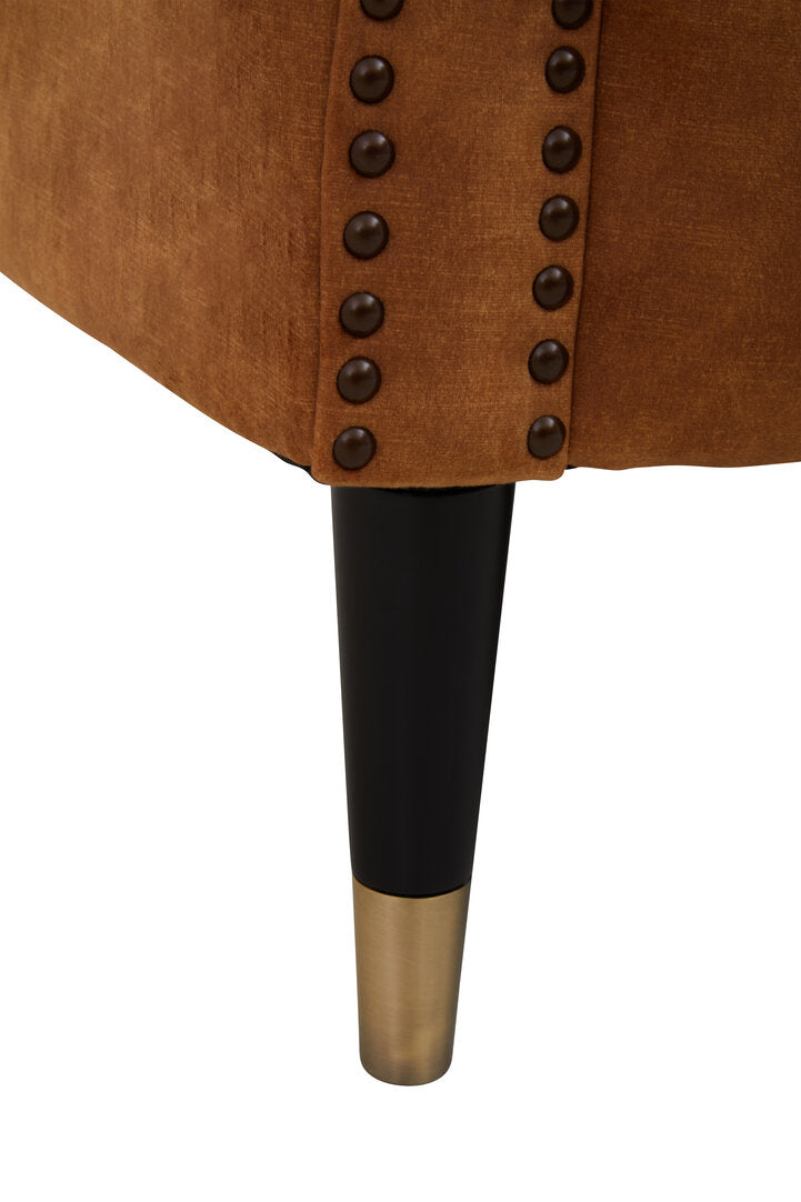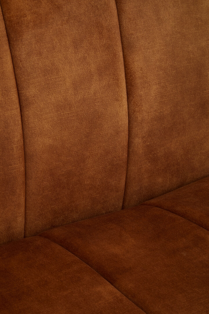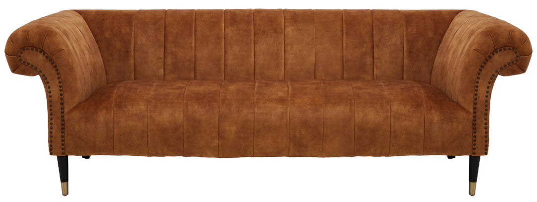 This three seat gold velvet sofa has channel tufting detail that accentuates the tactility and gentle curves of the design. Scrolled arms bring sophistication while pointed legs enhance aesthetics and stability.