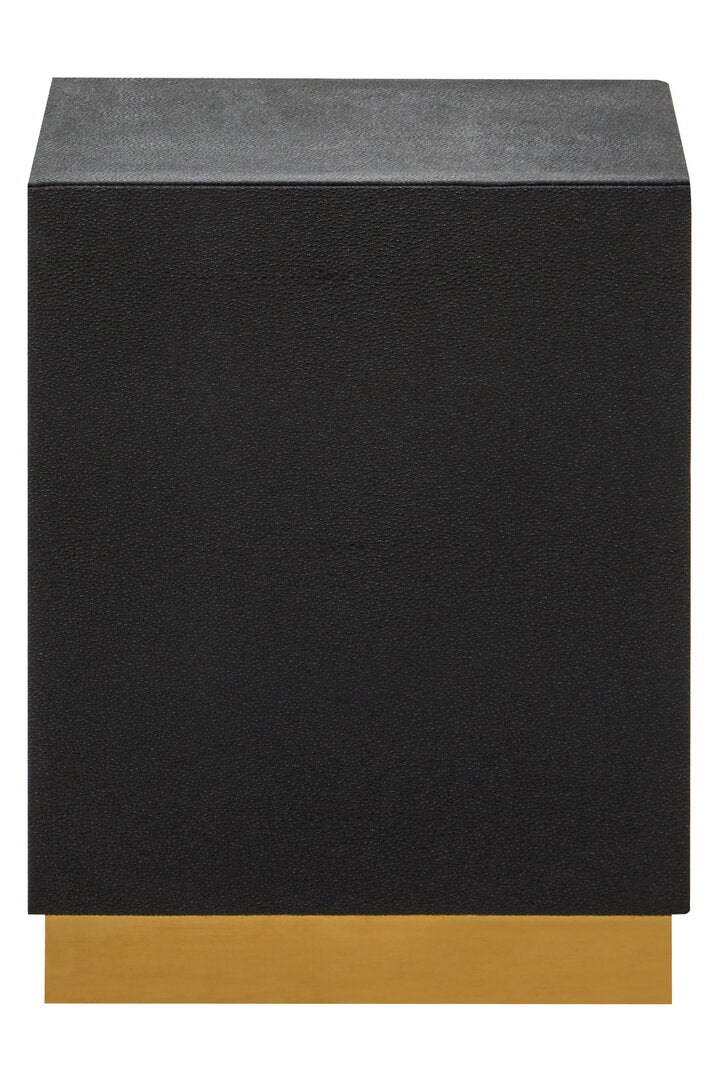 This square black stool features a minimalist yet luxe aesthetic with its granular black shagreen effect body and shiny gold finish base. The timeless combination of black and gold tones and contrasting surfaces makes for an instant focal point in the room. This versatile piece can be used as a table or stool.
