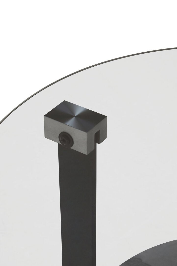The Imperia small round coffee table features a sleek grey glass top and a lower shelf with a ceramic marble effect, offering a modern and elegant contrast. The entire structure is gracefully supported by four distinctive black metal legs that provide stability and a bold, architectural flair.