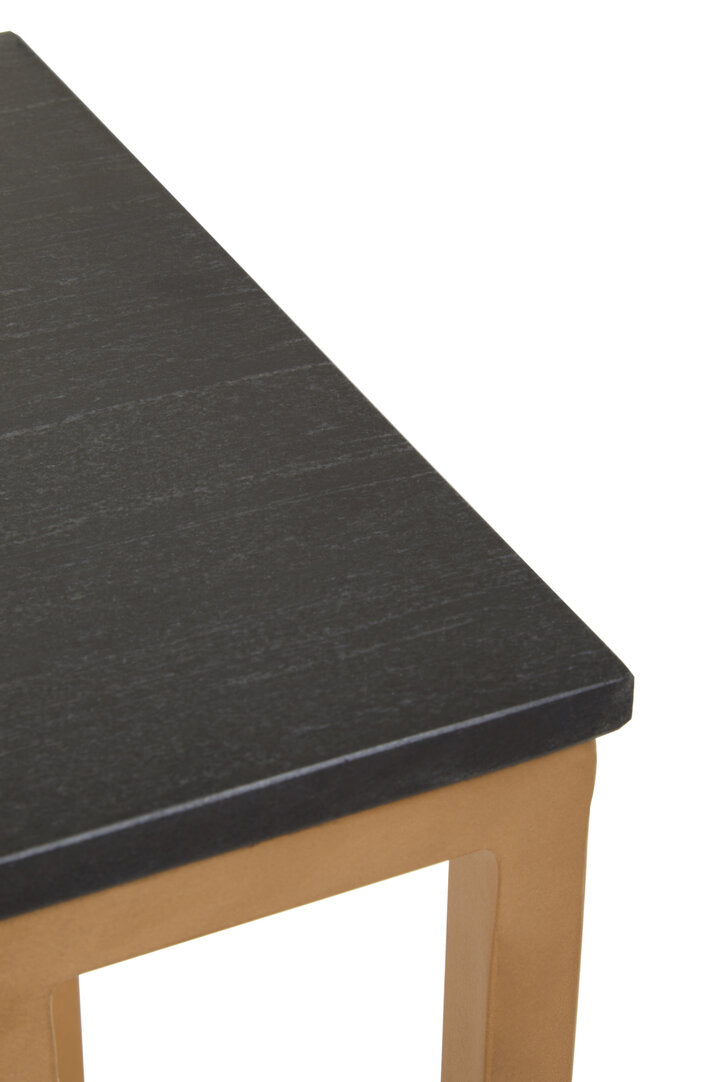 This side table boasts a sleek and minimal profile with the clean-lined angular frame. It combines elegance and practicality with its striking black marble top and sturdy gold metal frame. Designed for versatility, this side table is an ideal for drinks, books, or decor.