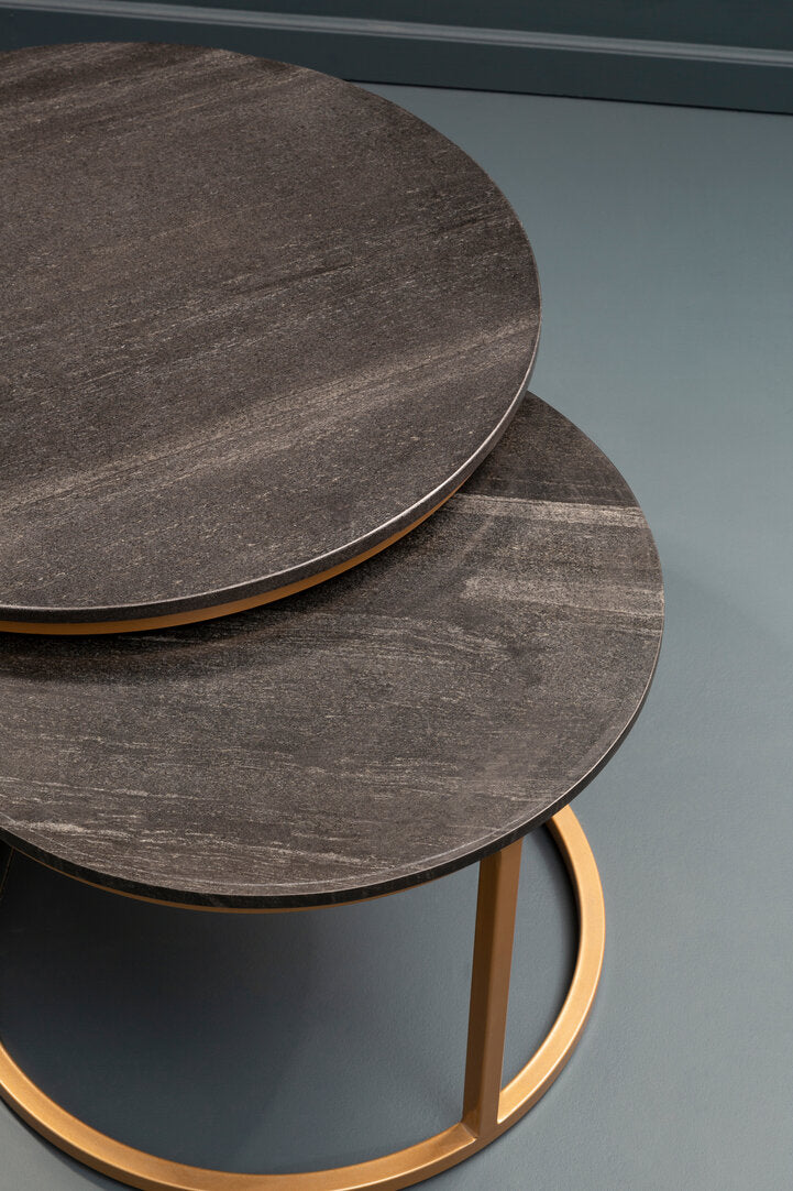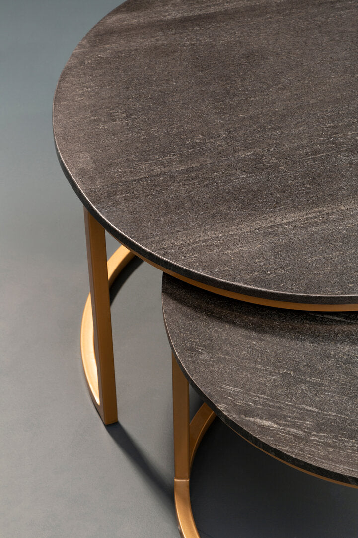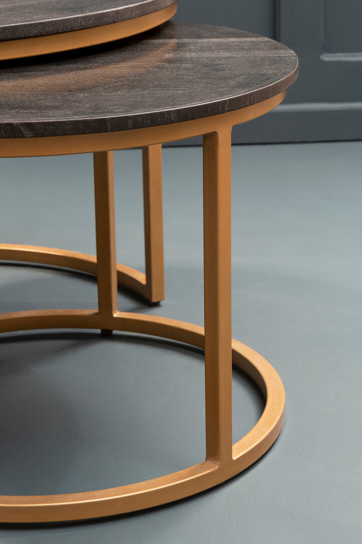 This stylish nesting table set blends contemporary elegance with functionality. Featuring round black tops and sturdy gold-finished metal frames, the set adds a luxurious touch to any living space. Perfect for modern interiors, this set enhances both style and practicality.