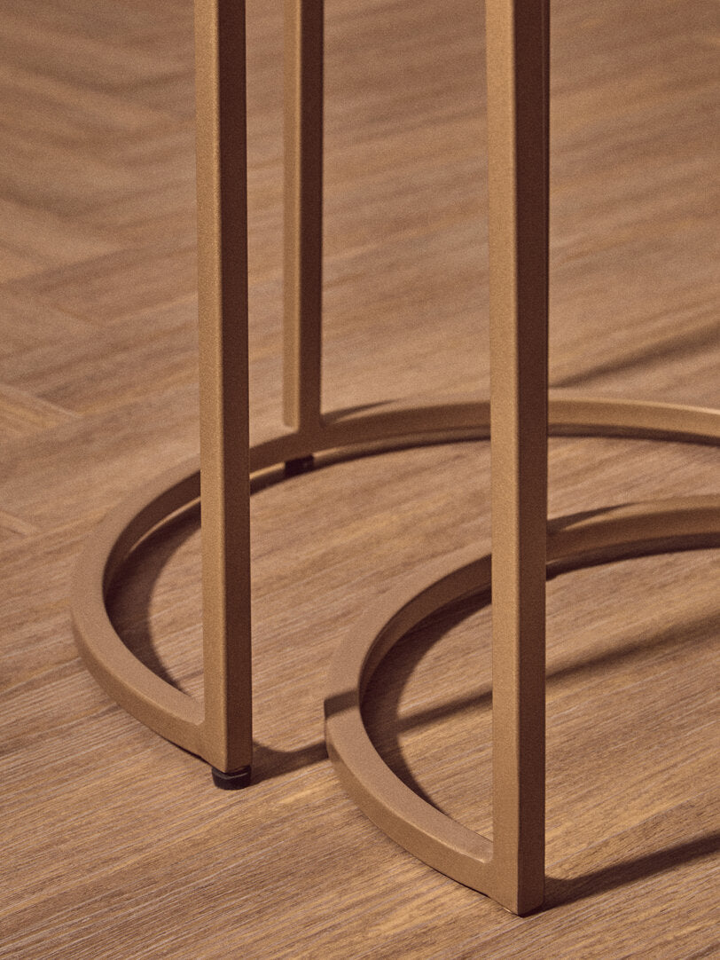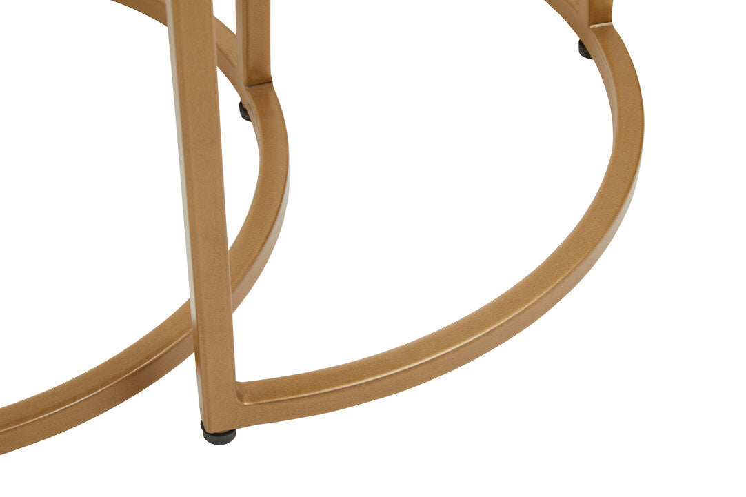 This set of two nesting tables offers a sophisticated touch with its semi-circular black marble tops and gold-finished metal frames. The versatile design allows them to be used separately for added surface space or neatly nested together when not in use, making them perfect for compact spaces.